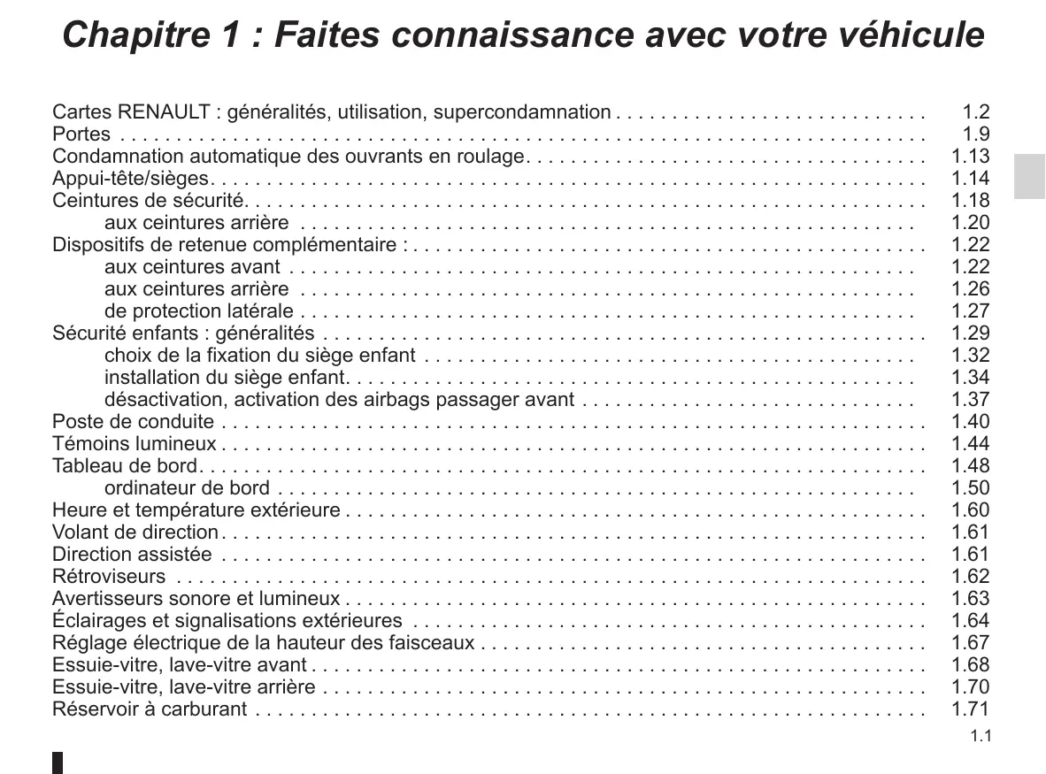 Chapitre 1 : Faites connaissance avec votre véhicule Cartes RENAULT : généralités, utilisation, supercondamnation. . . . . . . . . . . . . . . . . . . . . . . . . . . . Portes . . . . . . . . . . . . . . . . . . . . . . . . . . . . . . . . . . . . . . . . . . . . . . . . . . . . . . . . . . . . . . . . . . . . . . . . Condamnation automatique des ouvrants en roulage. . . . . . . . . . . . . . . . . . . . . . . . . . . . . . . . . . . . Appui-tête/sièges. . . . . . . . . . . . . . . . . . . . . . . . . . . . . . . . . . . . . . . . . . . . . . . . . . . . . . . . . . . . . . . . Ceintures de sécurité. . . . . . . . . . . . . . . . . . . . . . . . . . . . . . . . . . . . . . . . . . . . . . . . . . . . . . . . . . . . . aux ceintures arrière . . . . . . . . . . . . . . . . . . . . . . . . . . . . . . . . . . . . . . . . . . . . . . . . . . . . . . . Dispositifs de retenue complémentaire :. . . . . . . . . . . . . . . . . . . . . . . . . . . . . . . . . . . . . . . . . . . . . . aux ceintures avant . . . . . . . . . . . . . . . . . . . . . . . . . . . . . . . . . . . . . . . . . . . . . . . . . . . . . . . . aux ceintures arrière . . . . . . . . . . . . . . . . . . . . . . . . . . . . . . . . . . . . . . . . . . . . . . . . . . . . . . . de protection latérale. . . . . . . . . . . . . . . . . . . . . . . . . . . . . . . . . . . . . . . . . . . . . . . . . . . . . . . Sécurité enfants : généralités . . . . . . . . . . . . . . . . . . . . . . . . . . . . . . . . . . . . . . . . . . . . . . . . . . . . . . choix de la fixation du siège enfant . . . . . . . . . . . . . . . . . . . . . . . . . . . . . . . . . . . . . . . . . . . . installation du siège enfant. . . . . . . . . . . . . . . . . . . . . . . . . . . . . . . . . . . . . . . . . . . . . . . . . . . désactivation, activation des airbags passager avant. . . . . . . . . . . . . . . . . . . . . . . . . . . . . . Poste de conduite. . . . . . . . . . . . . . . . . . . . . . . . . . . . . . . . . . . . . . . . . . . . . . . . . . . . . . . . . . . . . . . Témoins lumineux. . . . . . . . . . . . . . . . . . . . . . . . . . . . . . . . . . . . . . . . . . . . . . . . . . . . . . . . . . . . . . . Tableau de bord. . . . . . . . . . . . . . . . . . . . . . . . . . . . . . . . . . . . . . . . . . . . . . . . . . . . . . . . . . . . . . . . . ordinateur de bord. . . . . . . . . . . . . . . . . . . . . . . . . . . . . . . . . . . . . . . . . . . . . . . . . . . . . . . . . Heure et température extérieure. . . . . . . . . . . . . . . . . . . . . . . . . . . . . . . . . . . . . . . . . . . . . . . . . . . . Volant de direction. . . . . . . . . . . . . . . . . . . . . . . . . . . . . . . . . . . . . . . . . . . . . . . . . . . . . . . . . . . . . . . Direction assistée . . . . . . . . . . . . . . . . . . . . . . . . . . . . . . . . . . . . . . . . . . . . . . . . . . . . . . . . . . . . . . . Rétroviseurs . . . . . . . . . . . . . . . . . . . . . . . . . . . . . . . . . . . . . . . . . . . . . . . . . . . . . . . . . . . . . . . . . . . Avertisseurs sonore et lumineux. . . . . . . . . . . . . . . . . . . . . . . . . . . . . . . . . . . . . . . . . . . . . . . . . . . . Éclairages et signalisations extérieures . . . . . . . . . . . . . . . . . . . . . . . . . . . . . . . . . . . . . . . . . . . . . . Réglage électrique de la hauteur des faisceaux. . . . . . . . . . . . . . . . . . . . . . . . . . . . . . . . . . . . . . . . Essuie-vitre, lave-vitre avant. . . . . . . . . . . . . . . . . . . . . . . . . . . . . . . . . . . . . . . . . . . . . . . . . . . . . . . Essuie-vitre, lave-vitre arrière. . . . . . . . . . . . . . . . . . . . . . . . . . . . . . . . . . . . . . . . . . . . . . . . . . . . . . Réservoir à carburant . . . . . . . . . . . . . . . . . . . . . . . . . . . . . . . . . . . . . . . . . . . . . . . . . . . . . . . . . . . .