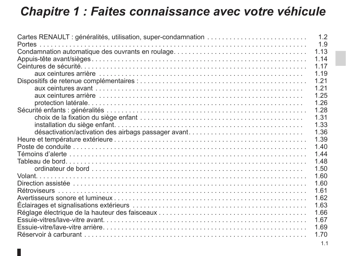Chapitre 1 : Faites connaissance avec votre véhicule Cartes RENAULT : généralités, utilisation, super-condamnation . . . . . . . . . . . . . . . . . . . . . . . . . . . Portes . . . . . . . . . . . . . . . . . . . . . . . . . . . . . . . . . . . . . . . . . . . . . . . . . . . . . . . . . . . . . . . . . . . . . . . . Condamnation automatique des ouvrants en roulage. . . . . . . . . . . . . . . . . . . . . . . . . . . . . . . . . . . . Appuis-tête avant/sièges. . . . . . . . . . . . . . . . . . . . . . . . . . . . . . . . . . . . . . . . . . . . . . . . . . . . . . . . . . Ceintures de sécurité. . . . . . . . . . . . . . . . . . . . . . . . . . . . . . . . . . . . . . . . . . . . . . . . . . . . . . . . . . . . . aux ceintures arrière . . . . . . . . . . . . . . . . . . . . . . . . . . . . . . . . . . . . . . . . . . . . . . . . . . . . . . . Dispositifs de retenue complémentaires :. . . . . . . . . . . . . . . . . . . . . . . . . . . . . . . . . . . . . . . . . . . . . aux ceintures avant . . . . . . . . . . . . . . . . . . . . . . . . . . . . . . . . . . . . . . . . . . . . . . . . . . . . . . . . aux ceintures arrière . . . . . . . . . . . . . . . . . . . . . . . . . . . . . . . . . . . . . . . . . . . . . . . . . . . . . . . protection latérale. . . . . . . . . . . . . . . . . . . . . . . . . . . . . . . . . . . . . . . . . . . . . . . . . . . . . . . . . . Sécurité enfants : généralités . . . . . . . . . . . . . . . . . . . . . . . . . . . . . . . . . . . . . . . . . . . . . . . . . . . . . . choix de la fixation du siège enfant . . . . . . . . . . . . . . . . . . . . . . . . . . . . . . . . . . . . . . . . . . . . installation du siège enfant. . . . . . . . . . . . . . . . . . . . . . . . . . . . . . . . . . . . . . . . . . . . . . . . . . . désactivation/activation des airbags passager avant. . . . . . . . . . . . . . . . . . . . . . . . . . . . . . . Heure et température extérieure. . . . . . . . . . . . . . . . . . . . . . . . . . . . . . . . . . . . . . . . . . . . . . . . . . . . Poste de conduite. . . . . . . . . . . . . . . . . . . . . . . . . . . . . . . . . . . . . . . . . . . . . . . . . . . . . . . . . . . . . . . Témoins d’alerte . . . . . . . . . . . . . . . . . . . . . . . . . . . . . . . . . . . . . . . . . . . . . . . . . . . . . . . . . . . . . . . . Tableau de bord. . . . . . . . . . . . . . . . . . . . . . . . . . . . . . . . . . . . . . . . . . . . . . . . . . . . . . . . . . . . . . . . . ordinateur de bord. . . . . . . . . . . . . . . . . . . . . . . . . . . . . . . . . . . . . . . . . . . . . . . . . . . . . . . . . Volant. . . . . . . . . . . . . . . . . . . . . . . . . . . . . . . . . . . . . . . . . . . . . . . . . . . . . . . . . . . . . . . . . . . . . . . . . Direction assistée . . . . . . . . . . . . . . . . . . . . . . . . . . . . . . . . . . . . . . . . . . . . . . . . . . . . . . . . . . . . . . . Rétroviseurs . . . . . . . . . . . . . . . . . . . . . . . . . . . . . . . . . . . . . . . . . . . . . . . . . . . . . . . . . . . . . . . . . . . Avertisseurs sonore et lumineux. . . . . . . . . . . . . . . . . . . . . . . . . . . . . . . . . . . . . . . . . . . . . . . . . . . . Éclairages et signalisations extérieurs . . . . . . . . . . . . . . . . . . . . . . . . . . . . . . . . . . . . . . . . . . . . . . . Réglage électrique de la hauteur des faisceaux. . . . . . . . . . . . . . . . . . . . . . . . . . . . . . . . . . . . . . . . Essuie-vitres/lave-vitre avant. . . . . . . . . . . . . . . . . . . . . . . . . . . . . . . . . . . . . . . . . . . . . . . . . . . . . . . Essuie-vitre/lave-vitre arrière. . . . . . . . . . . . . . . . . . . . . . . . . . . . . . . . . . . . . . . . . . . . . . . . . . . . . . . Réservoir à carburant . . . . . . . . . . . . . . . . . . . . . . . . . . . . . . . . . . . . . . . . . . . . . . . . . . . . . . . . . . . .