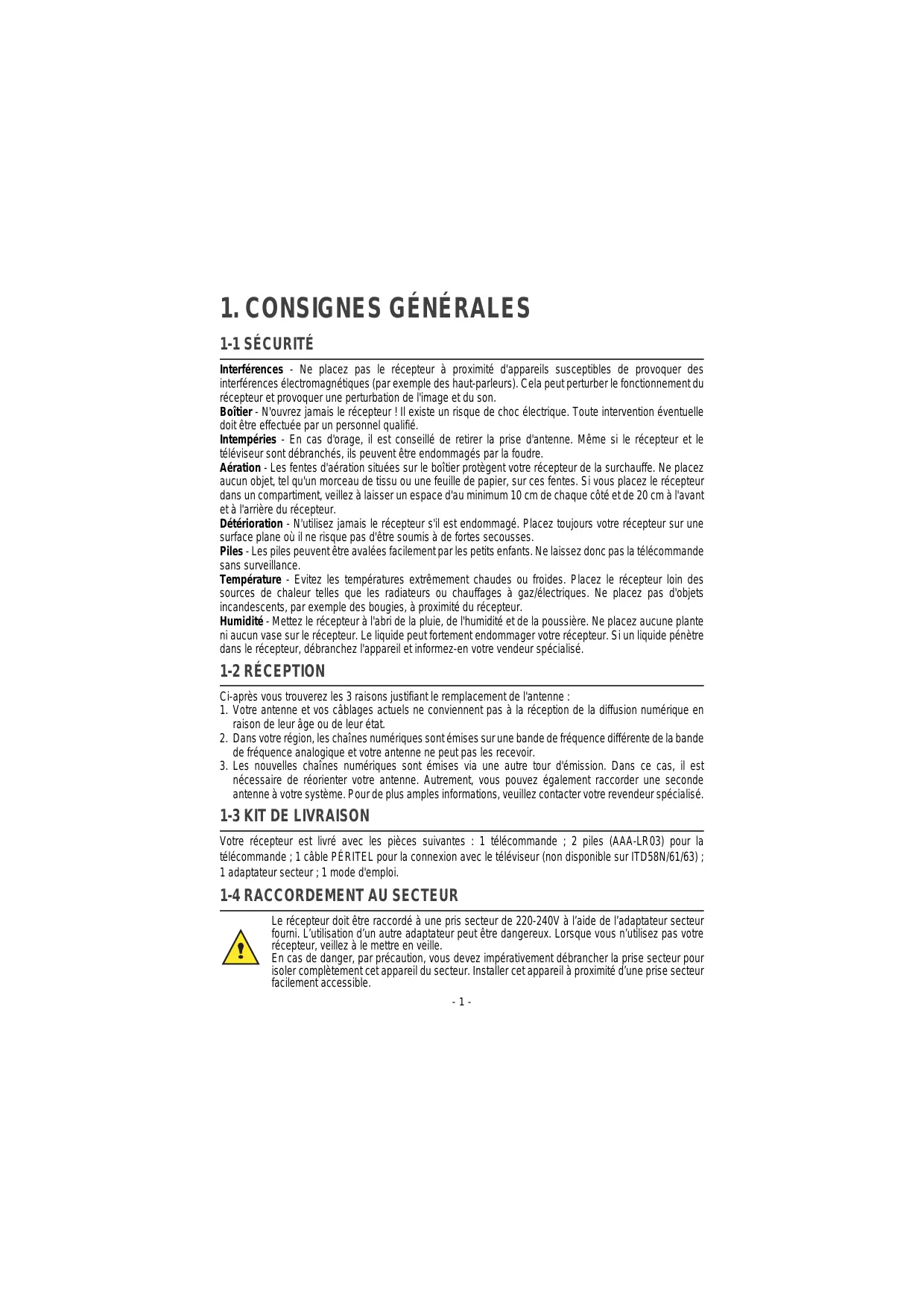 Le récepteur doit être raccordé à une pris secteur de 220-240V à l’aide de l’adaptateur secteur fourni. L’utilisation d’un autre adaptateur peut être dangereux. Lorsque vous n’utilisez pas votre récepteur, veillez à le mettre en veille. En cas de danger, par précaution, vous devez impérativement débrancher la prise secteur pour isoler complètement cet appareil du secteur. Installer cet appareil à proximité d’une prise secteur facilement accessible.