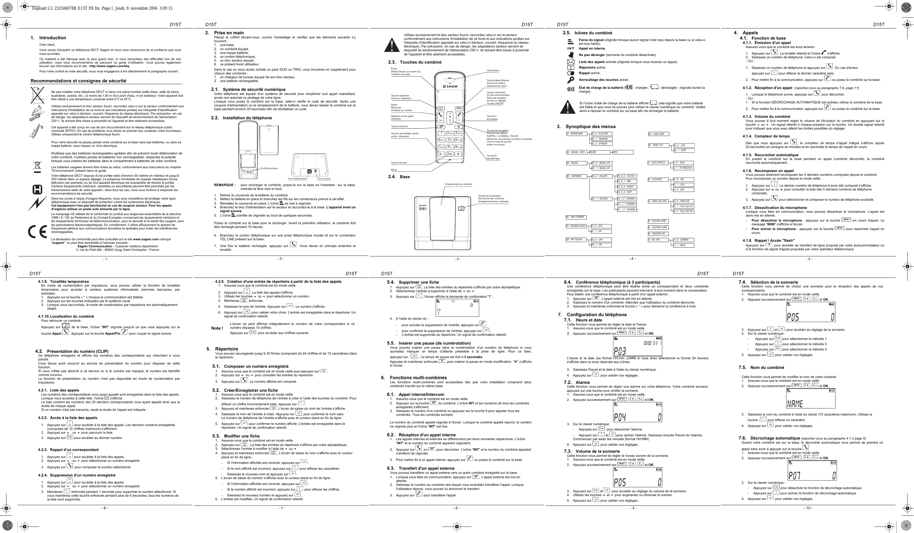 D15T Prise en main Cher client, Vous venez d'acquérir un téléphone DECT Sagem et nous vous remercions de la confiance que vous nous accordez. Ce matériel a été fabriqué avec le plus grand soin, si vous rencontrez des difficultés lors de son utilisation, nous vous recommandons de parcourir ce guide d’utilisation. Vous pouvez également trouver ces informations sur le site : http://www.sagem.com/faq Recommandations et consignes de sécurité Écran Affiche l'heure, le numéro du combiné et la date Utilisez exclusivement le bloc secteur fourni, raccordez celui-ci sur le secteur conformément aux instructions d'installation de ce livret et aux indications portées sur l'étiquette d'identification apposée sur celui-ci (tension, courant, fréquence du réseau électrique). Par précaution, en cas de danger, les adaptateurs secteur servent de dispositif de sectionnement de l'alimentation 230 V. Ils doivent être situés à proximité de l'appareil et être aisément accessibles.