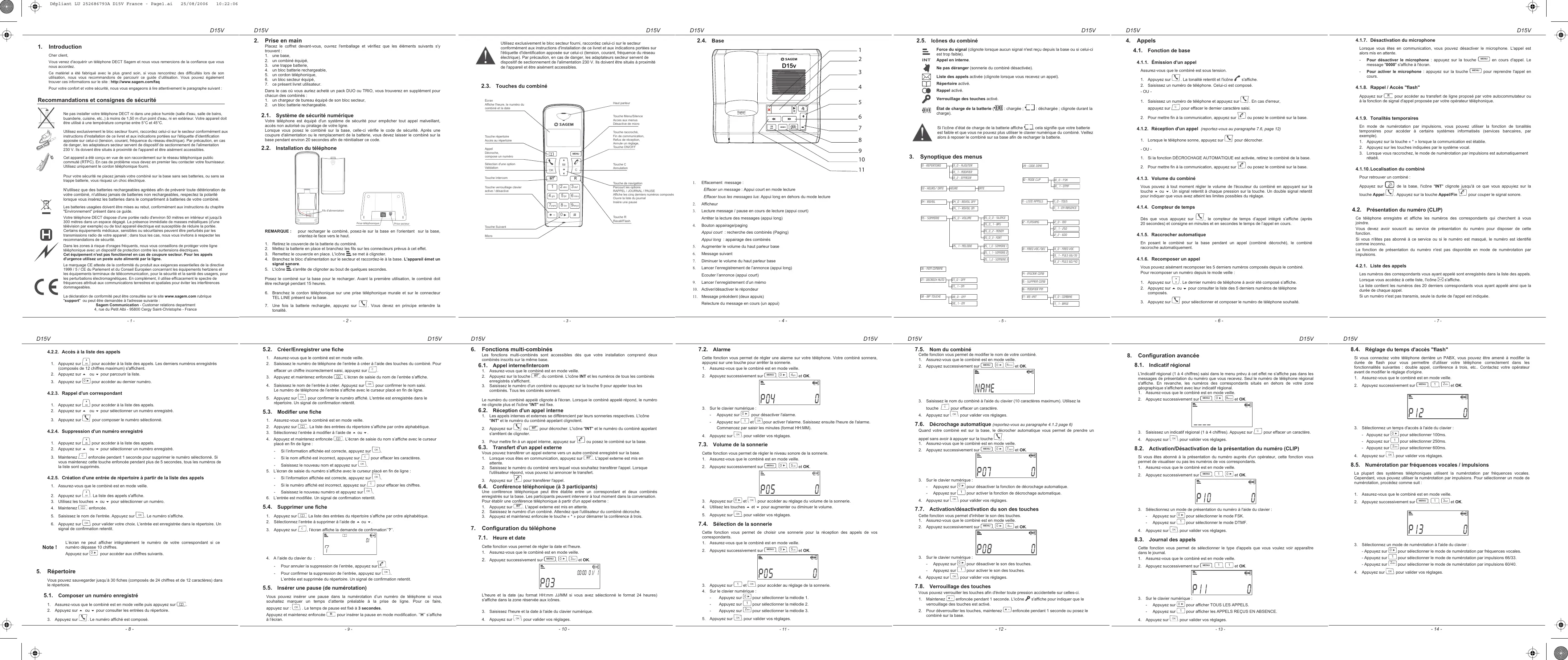 Introduction Cher client, Vous venez d'acquérir un téléphone DECT Sagem et nous vous remercions de la confiance que vous nous accordez. Ce matériel a été fabriqué avec le plus grand soin, si vous rencontrez des difficultés lors de son utilisation, nous vous recommandons de parcourir ce guide d’utilisation. Vous pouvez également trouver ces informations sur le site : http://www.sagem.com/faq Pour votre confort et votre sécurité, nous vous engageons à lire attentivement le paragraphe suivant : Recommandations et consignes de sécurité Ne pas installer votre téléphone DECT ni dans une pièce humide (salle d'eau, salle de bains, buanderie, cuisine, etc..) à moins de 1,50 m d'un point d'eau, ni en extérieur. Votre appareil doit être utilisé à une température comprise entre 5°C et 45°C. Utilisez exclusivement le bloc secteur fourni, raccordez celui-ci sur le secteur conformément aux instructions d'installation de ce livret et aux indications portées sur l'étiquette d'identification apposée sur celui-ci (tension, courant, fréquence du réseau électrique). Par précaution, en cas de danger, les adaptateurs secteur servent de dispositif de sectionnement de l'alimentation 230 V. Ils doivent être situés à proximité de l'appareil et être aisément accessibles. D15V Prise en main Écran Affiche l'heure, le numéro du combiné et la date Appel Décroche, compose un numéro Sélection d'une option Validation Pour votre sécurité ne placez jamais votre combiné sur la base sans ses batteries, ou sans sa trappe batterie, vous risquez un choc électrique. Dans les zones à risque d'orages fréquents, nous vous conseillons de protéger votre ligne téléphonique avec un dispositif de protection contre les surtensions électriques. Cet équipement n'est pas fonctionnel en cas de coupure secteur. Pour les appels d'urgence utilisez un poste auto alimenté par la ligne. Le marquage CE atteste de la conformité du produit aux exigences essentielles de la directive 1999 / 5 / CE du Parlement et du Conseil Européen concernant les équipements hertziens et les équipements terminaux de télécommunication, pour la sécurité et la santé des usagers, pour les perturbations électromagnétiques. En complément, il utilise efficacement le spectre de fréquences attribué aux communications terrestres et spatiales pour éviter les interférences dommageables. La déclaration de conformité peut être consultée sur le site www.sagem.com rubrique "support" ou peut être demandée à l'adresse suivante : Sagem Communication - Customer relations department 4, rue du Petit Albi - 95800 Cergy Saint-Christophe - France