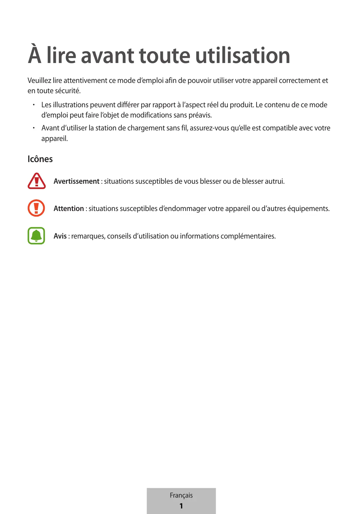 - Avant d’utiliser le chargeur sans fil, assurez-vous qu’il est compatible avec votre appareil. Liste des icônes