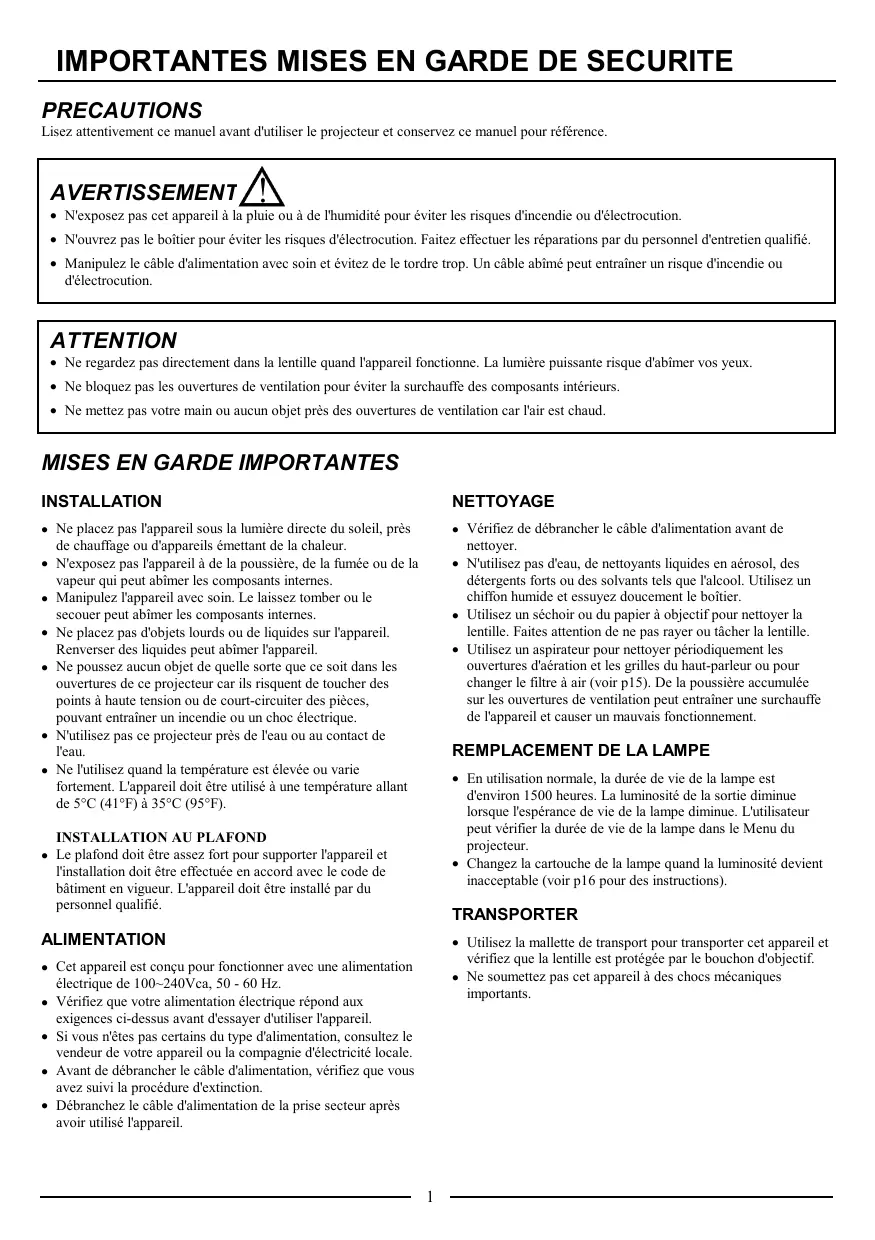 Importantes mises en garde de sécurité 01 Accessoires 02 Parties du projecteur 03 Installation 04 Connexions 05 Utilisation de base 07 Utiliser la télécommande 10 Utilisation des menus (OSD) 11 Dépannage (témoins) 14 Nettoyer et remplacer le filtre à air 14 Remplacer la lampe 15