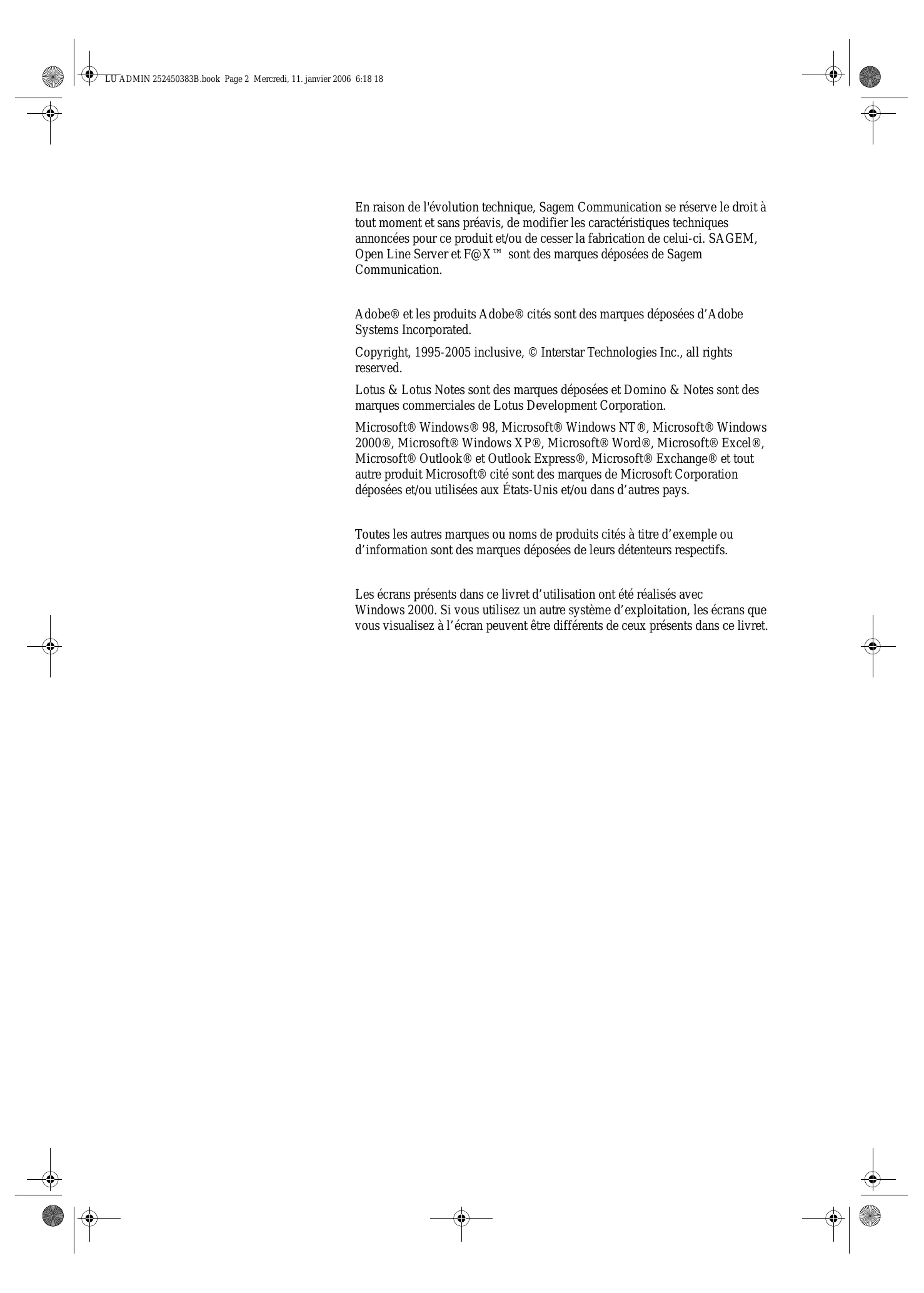 En raison de l'evolution technique,Sagem Communication se reserve le droit à tout moment et sans préavis,de modifier les caractéristiques techniquesannonées pour ce produit et/ou de cesser la fabrication de celui-ci.SAGEM, Open Line Server et F@X^ sont des marques déposées de Sagem Communication.