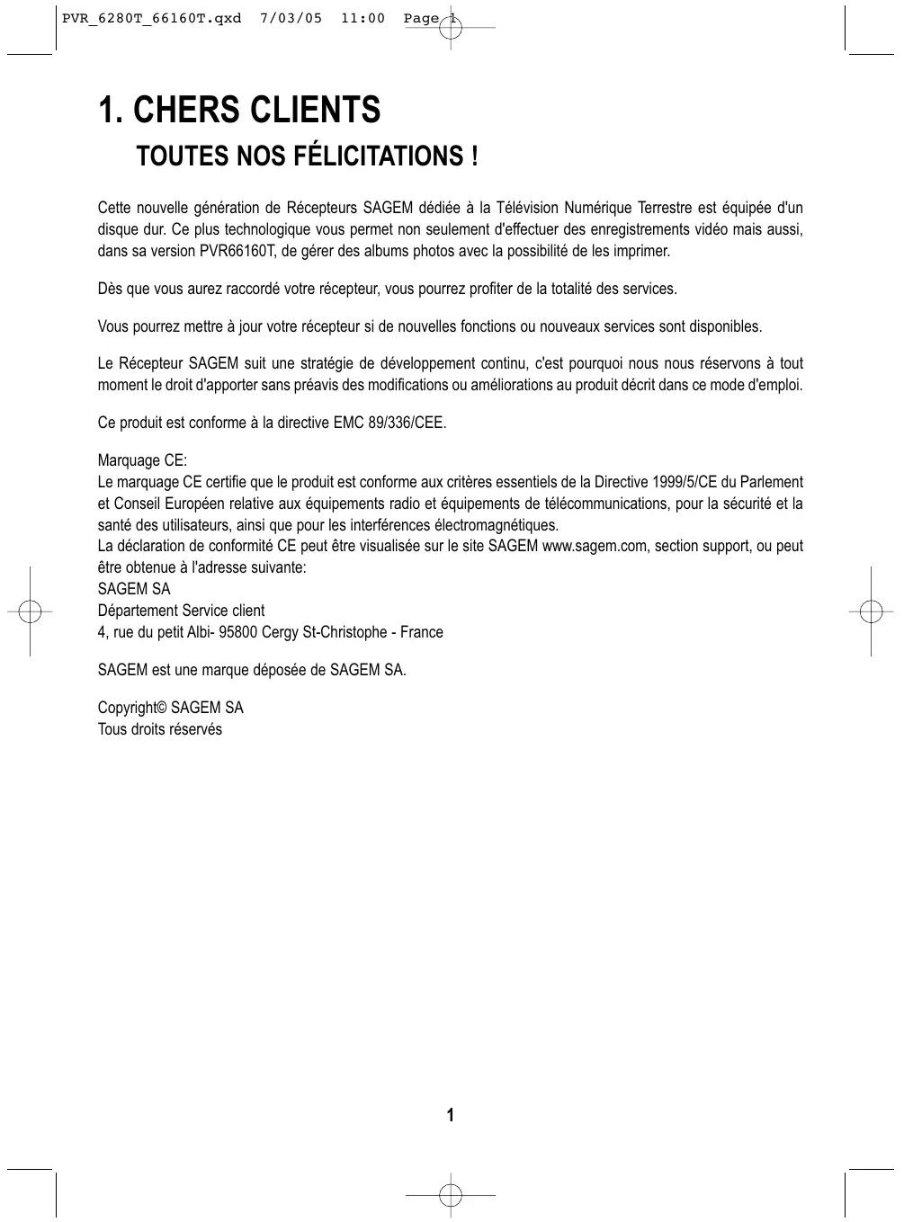 La procédure à suivre est la suivante : 1) Le matériel neuf est garanti (pièces et main d'œuvre)* par SAGEM SA, dans les conditions et selon les modalités ci-après, contre tous les défauts de fabrication pendant une durée de 12 mois à compter de la date d'achat du matériel, la preuve d'achat faisant foi (pour les accessoires neufs (cordons, télécommande, etc) : 3 mois à compter de la date d'achat). Nous vous recommandons donc de garder très précieusement votre facture d'achat ou ticket de caisse comme preuve de date d'achat. 2) Les matériels ayant fait l'objet d'une réparation pendant la période de garantie visée ci-dessus sont garantis (pièces et Main d'œuvre)* par SAGEM SA jusqu'à la dernière de ces deux dates : expiration de la durée de garantie visée ci-dessus ou trois (3) mois à compter de l'intervention SAGEM SA. Cette garantie s'applique pour autant que le matériel ait été utilisé dans des conditions normales et conformément à sa destination. 3) Pendant cette période de garantie de 12 mois, le récepteur défectueux sera réparé gratuitement. Le client devra néanmoins retourner, à ses frais (transport + assurance), le matériel défectueux dans un emballage adéquat avec l'ensemble des accessoires d'origine (les matériels endommagés durant le transport ne sont pas pris en charge au titre de la garantie) à l'un de nos Centres de Réparation Agréés dont l'adresse vous sera communiquée en appelant notre Centre d'appels au 01 30 73 04 04. Au titre de cette garantie, votre matériel sera réparé ou échangé (au seul choix de SAGEM SA) et renvoyé à votre adresse en France, gratuitement. Aucun matériel de prêt ne sera fourni pendant le délai de réparation 4) Avant d'expédier votre matériel au Centre de Réparation Agréé, n'oubliez pas de : - joindre au matériel toutes vos coordonnées (nom, adresse, et numéro de téléphone) - vous assurer que tous les accessoires sont inclus avec le matériel, si possible dans l'emballage d'origine - joindre également une copie de la preuve d'achat de votre matériel ou de la carte de garantie dûment datée et complétée, lors de l'achat, par votre vendeur Le matériel bénéficie, en tout état de cause, de la garantie légale contre les conséquences des défauts ou vices cachés conformément aux articles 1641 et suivants du Code Civil. Les droits légaux dont bénéficient les consommateurs au titre de dispositions légales impératives restent en vigueur et ne sont en aucun cas affectés par la présente garantie * hors cas d'exclusions de garantie mentionnés plus loin dans ce document.
