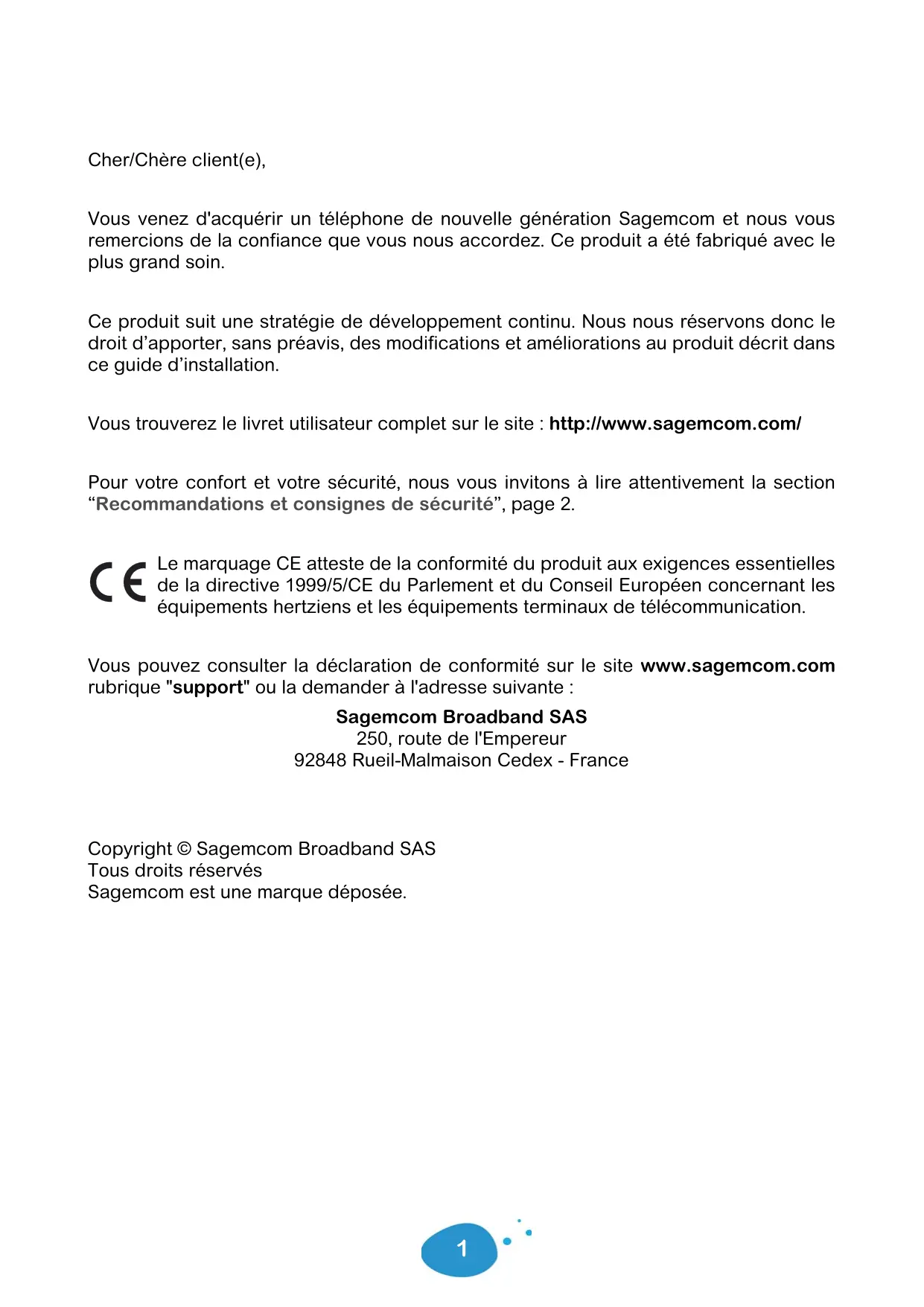 Cher/Chère client(e), Vous venez d'acquérir un téléphone de nouvelle génération Sagemcom et nous vous remercions de la confiance que vous nous accordez. Ce produit a été fabriqué avec le plus grand soin. Ce produit suit une stratégie de développement continu. Nous nous réservons donc le droit d'apporter, sans préavis, des modifications et améliorations au produit décrit dans ce guide d'installation. Vous trouverez le livret utilisateur complet sur le site : http://www.sagemcom.com/ Pour votre confort et votre sécurité, nous vous invitons à lire attentivement la section “Recommandations et consignes de sécurité”, page 2. Le marquage CE atteste de la conformité du produit aux exigences essentielles C de la directive 1999/5/CE du Parlement et du Conseil Européen concernant les équipements hertziens et les équipements terminaux de télécommunication. Vous pouvez consulter la déclaration de conformité sur le site www.sagemcom.com rubrique "support" ou la demander à l'adresse suivante : Sagemcom Broadband SAS 250, route de l'Empereur 92848 Rueil-Malmaison Cedex - France Copyright © Sagemcom Broadband SAS Tous droits réservés Sagemcom est une marque déposée.