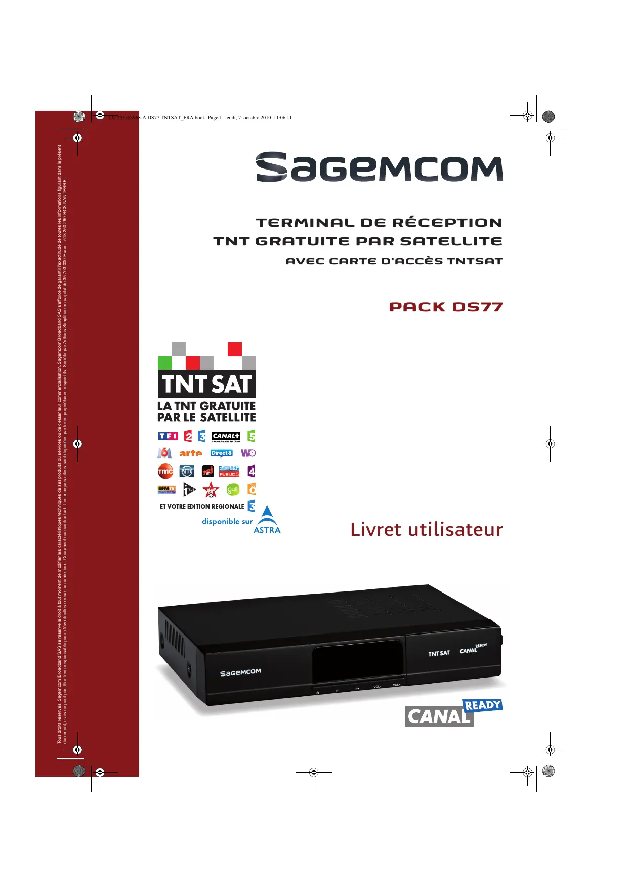 Tous droits réservés. Sagemcom Broadband SAS se réserve le droit à tout moment de modifier les caractéristiques techniques de ses produits ou services ou de cesser leur commercialisation. Sagemcom Broadband SAS s'efforce de garantir l'exactitude de toutes les informations figurant dans le présent document, mais ne peut pas être tenu responsable pour d'éventuelles erreurs ou omissions. Document non contractuel. Les marques citées sont déposées par leurs propriétaires respectifs. Société par Actions Simplifiée au capital de 35 703 000 Euros - 518 250 260 RCS NANTERRE. LU 253353968-A DS77 TNTSAT_FRA.book Page 1 Jeudi, 7. octobre 2010 11:06 11