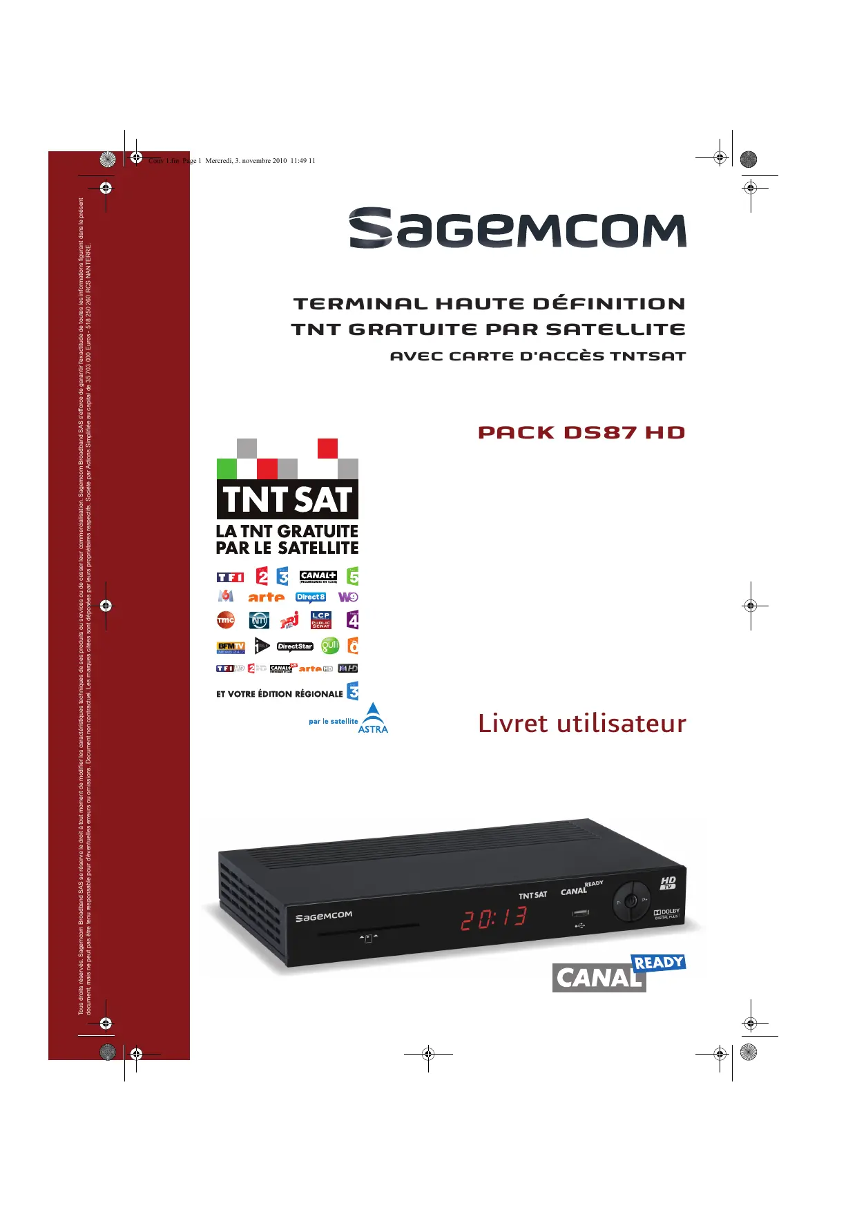 Toutes nos félicitations ! Le pack satellite TNTSAT de Sagemcom est dédié à la réception des chaînes de la TNT disponibles par satellite avec TNTSAT et vous permet de recevoir les émissions en définition standard et en haute définition. Il est composé d'un terminal de réception numérique haute définition et d’une carte d'accès. Pour bénéficier, avec ce pack DS87 HD, de la qualité d'image Haute Définition, il est nécessaire d'être équipé d'un téléviseur à écran plat avec connecteur HDMITM. HDMI (High Definition Multimedia Interface) désigne une interface de connection de Haute Qualité, permettant le transport de vidéo Haute Définition et de son multicanaux en numérique. La qualité d'image restituée sur l'écran sera en Haute Définition pour autant que votre téléviseur soit prêt pour la Haute Définition, que vous ayez utilisé un cordon HDMITM pour relier le terminal de réception DS87 HD et votre écran, et que l'émission regardée soit effectivement diffusée en Haute Définition. Votre revendeur peut vous aider à vérifier que votre écran est prêt pour la HD. Dès le raccordement de votre terminal de réception, vous pouvez profiter de la totalité des services. Vous pouvez mettre à jour votre terminal de réception si de nouveaux services deviennent disponibles. Le terminal de réception Sagemcom suit une stratégie de développement continu. Nous nous réservons donc le droit d'apporter, sans préavis, des modifications et améliorations au produit décrit dans ce livret utilisateur. Marquage CE : Le marquage CE atteste de la conformité des produits aux exigences essentielles de la directive R&TTE 1999/5/CE relative aux équipements hertziens et de télécommunication, ainsi qu'aux directives 2006/95/CE sur la sécurité, 2004/108/CE concernant la compatibilité électromagnétique et ErP 2009/125/CE relative aux exigences d’écoconception, définies par le Parlement européen et le Conseil afin de minimiser les interférences électromagnétiques, assurer la sécurité des utilisateurs et de leurs biens ainsi que préserver leur santé, et réduire l'impact des produits sur l'environnement. En outre, ce marquage certifie aussi la conformité du produit aux normes harmonisées suivantes : EN60065, EN55013, EN55020, EN61000-3-2, EN61000-3-3, EN62311. La déclaration de conformité CE peut être consultée sur le site www.sagemcom.com de Sagemcom, dans la section support, ou obtenue à l'adresse suivante : Sagemcom Broadband SAS - Service des relations clientèle 250, route de l’Empereur 92848 Rueil-Malmaison Cedex - FRANCE Copyright © Sagemcom Broadband SAS Tous droits réservés. Sagemcom est une marque déposée. Ce terminal de réception Haute Définition Sagemcom répond aux spécifications "HD TV", et intègre la technologie HDMITM. Le logo "HD TV" est une marque de l'EICTA. HDMI, le logo HDMI et High-Definition Multimedia Interface sont des marques ou des marques déposées de HDMI Licensing LLC. Fabriqué sous Licence de Dolby Laboratories. Le terme "Dolby" et le sigle double D sont des marques commerciales de Dolby Laboratories. Le logo TNTSAT est une marque sous licence GROUPE CANAL+ ou de ses filiales. Le label CANAL READY indique que le terminal peut recevoir LES CHAÎNES CANAL+ ou CANALSAT, en souscrivant l'abonnement correspondant. Vous trouverez sur le site www.tntsat.tv toutes les informations utiles sur le service TNTSAT ainsi que de nombreuses informations sur la TNT par satellite. Vous trouverez sur le site www.canalready.fr toutes les offres commerciales sur LES CHAÎNES CANAL+ ou CANALSAT.