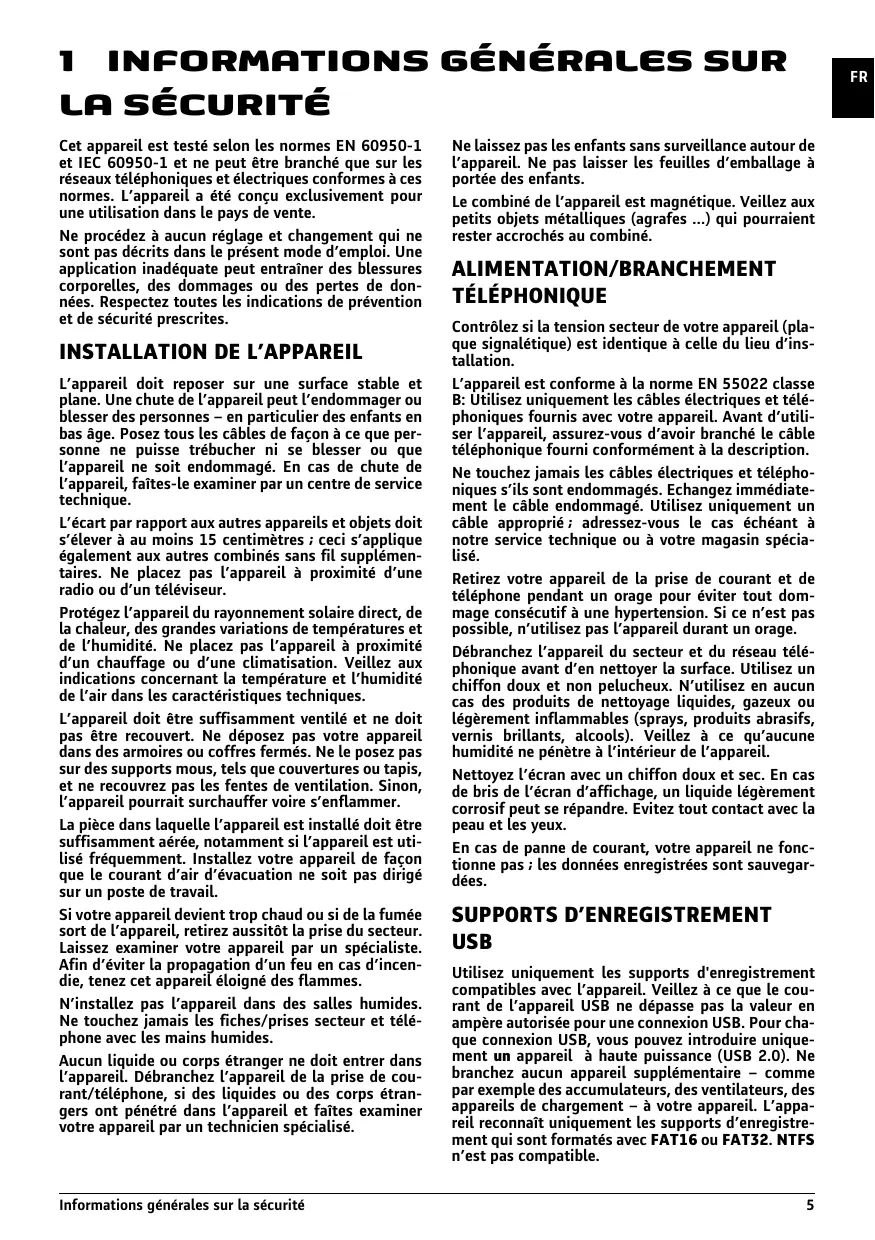 L’appareil est conforme à la norme EN 55022 classe B: Utilisez uniquement les câbles électriques et téléphoniques fournis avec votre appareil. Avant d’utiliser l’appareil, assurez-vous d’avoir branché le câble téléphonique fourni conformément à la description. Ne touchez jamais les câbles électriques et téléphoniques s’ils sont endommagés. Echangez immédiatement le câble endommagé. Utilisez uniquement un câble approprié ; adressez-vous le cas échéant à notre service technique ou à votre magasin spécialisé. Retirez votre appareil de la prise de courant et de téléphone pendant un orage pour éviter tout dommage consécutif à une hypertension. Si ce n’est pas possible, n’utilisez pas l’appareil durant un orage. Débranchez l’appareil du secteur et du réseau téléphonique avant d’en nettoyer la surface. Utilisez un chiffon doux et non pelucheux. N’utilisez en aucun cas des produits de nettoyage liquides, gazeux ou légèrement inflammables (sprays, produits abrasifs, vernis brillants, alcools). Veillez à ce qu’aucune humidité ne pénètre à l’intérieur de l’appareil. Nettoyez l’écran avec un chiffon doux et sec. En cas de bris de l’écran d’affichage, un liquide légèrement corrosif peut se répandre. Evitez tout contact avec la peau et les yeux. En cas de panne de courant, votre appareil ne fonctionne pas ; les données enregistrées sont sauvegardées. Emission