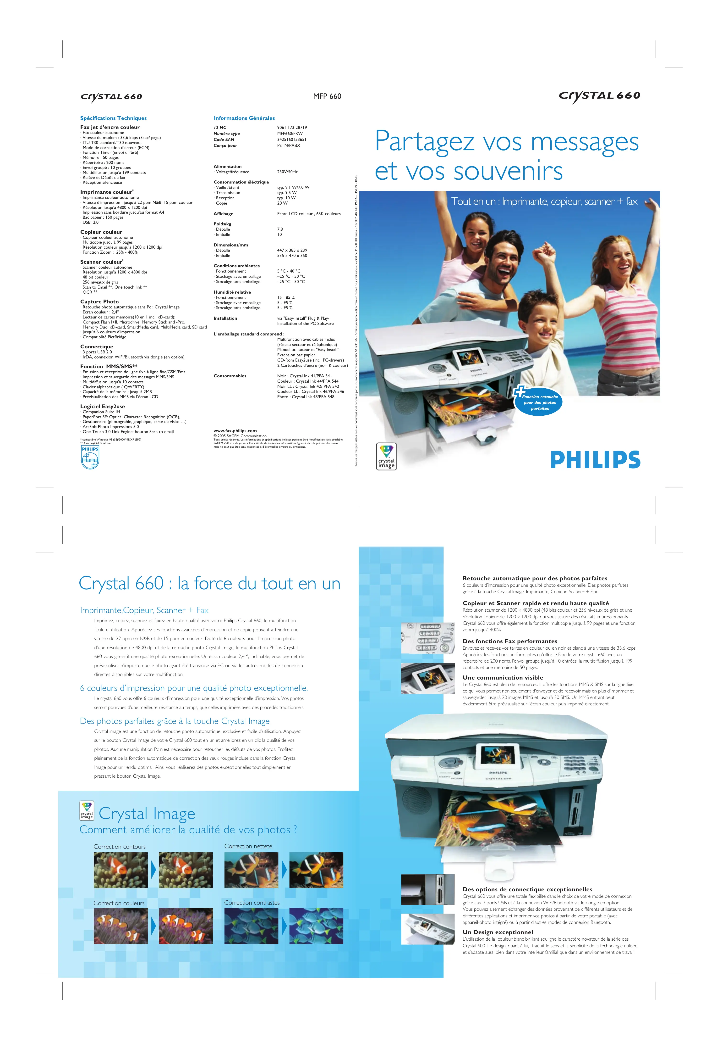 PHILIPS Retouche automatique pour des photos parfaites 6 couleurs d'impression pour une qualité photo exceptionnelle. Des photos parfaites grâce à la touche Crystal Image. Imprimante, Copieur, Scanner + Fax