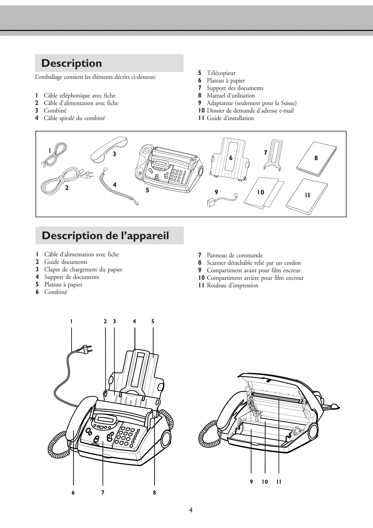 Télécopieur Plateau à papier Support des documents Manuel d’utilisation Adaptateur (seulement pour la Suisse) Dossier de demande d'adresse e-mail Guide d’installation