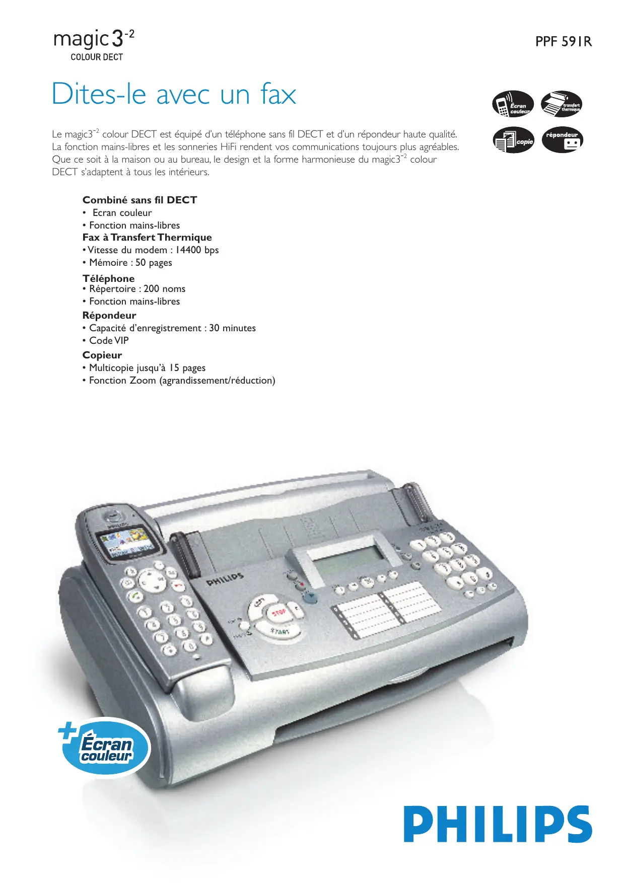 La fonction mains-libres et les sonneries HiFi rendent vos communications toujours plus agréables. Que ce soit à la maison ou au bureau, le design et la forme harmonieuse du magic3-2 colour DECT s’adaptent à tous les intérieurs. Combiné sans fil DECT • Ecran couleur • Fonction mains-libres Fax à Transfert Thermique • Vitesse du modem : 14400 bps Rappel des 10 derniers numéros (Bis) Mémorisation de l’appel sortant Identification de l’appelant**