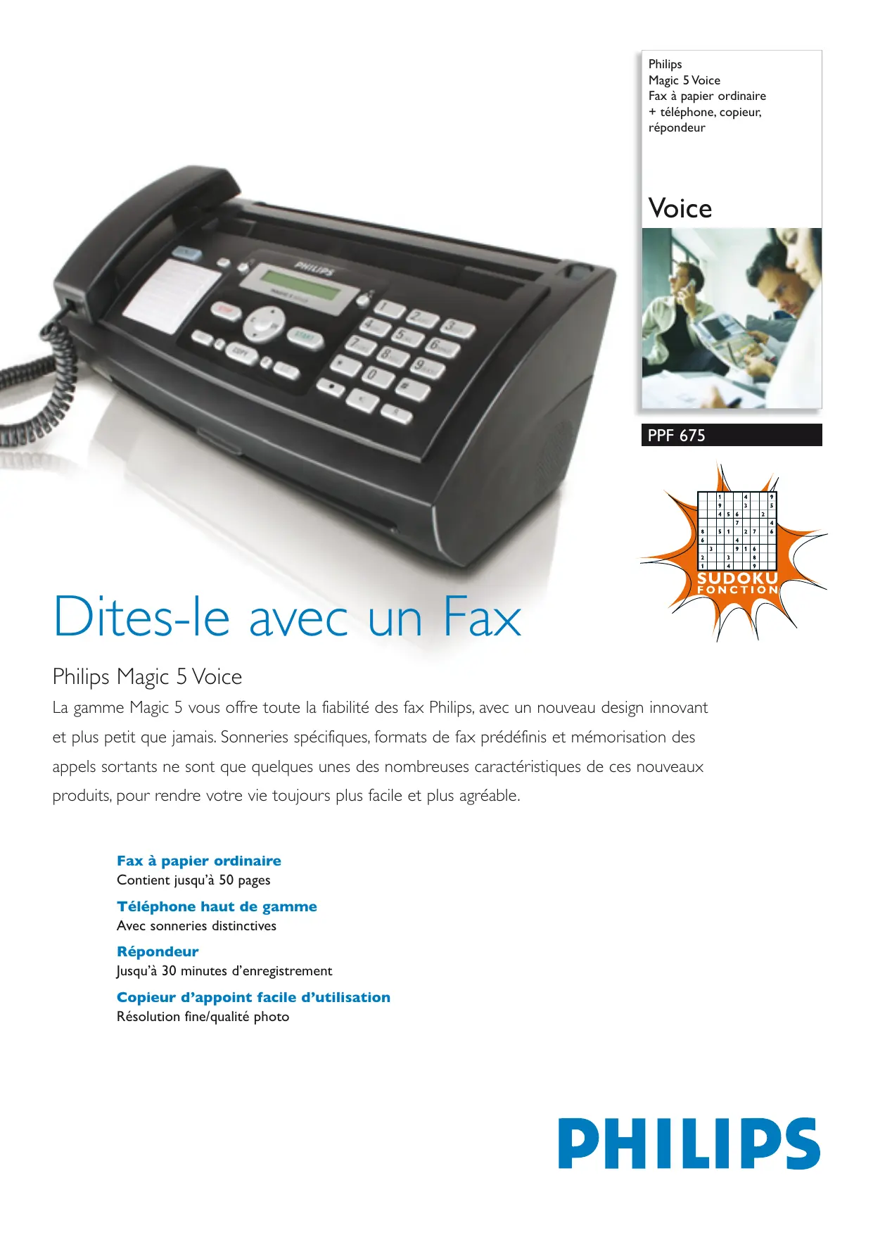 Fax à papier ordinaire Contient jusqu’à 50 pages Téléphone haut de gamme Avec sonneries distinctives Répondeur Jusqu’à 30 minutes d’enregistrement Copieur d’appoint facile d’utilisation · Mémorisation de l’appel sortant Répondeur · Capacité d’enregistrement : jusqu’à 30 minutes