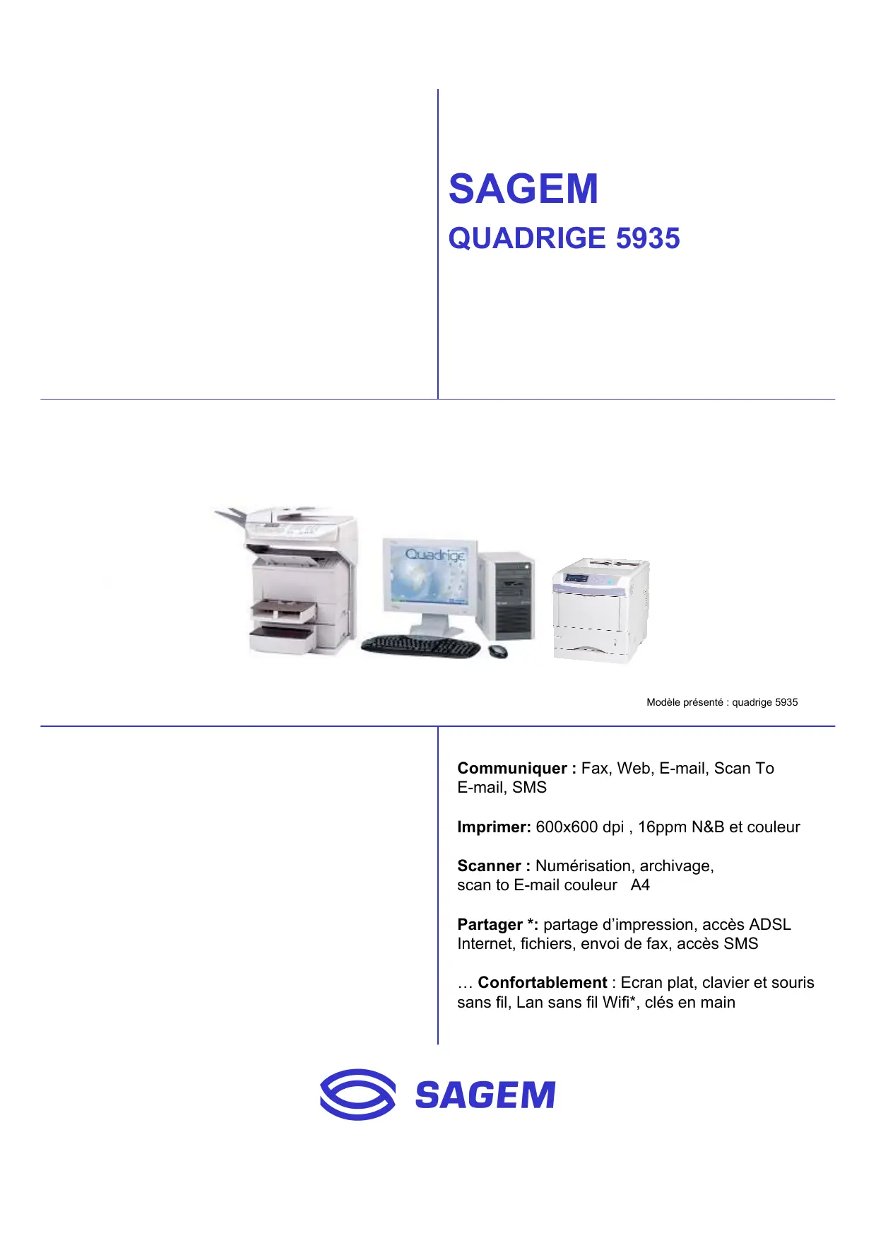 SAGEM QUADRIGE 5935 Modèle présenté : quadrige 5935 Communiquer : Fax, Web, E-mail, Scan To E-mail, SMS Imprimer: 600x600 dpi , 16ppm N&B et couleur Scanner : Numérisation, archivage, scan to E-mail couleur A4 Partager *: partage d’impression, accès ADSL Internet, fichiers, envoi de fax, accès SMS … Confortablement : Ecran plat, clavier et souris sans fil, Lan sans fil Wifi*, clés en main
