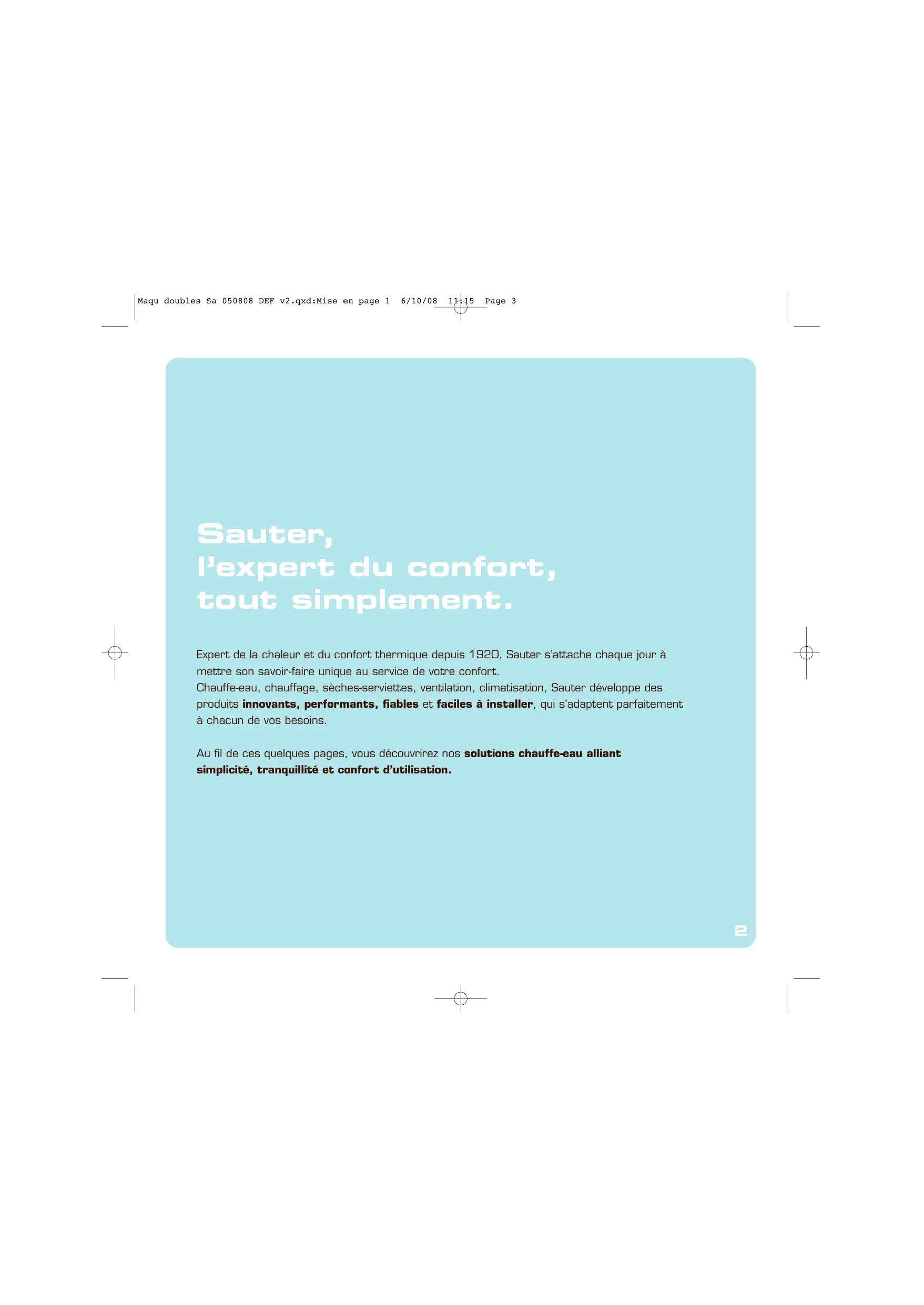 Maqu doubles Sa 050808 DEF v2.qxd:Mise en page 1 6/10/08 11:15 Page 3 Sauter, l’expert du confort, tout simplement. Expert de la chaleur et du confort thermique depuis 1920, Sauter s’attache chaque jour à mettre son savoir-faire unique au service de votre confort. Chauffe-eau, chauffage, sèches-serviettes, ventilation, climatisation, Sauter développe des produits innovants, performants, fiables et faciles à installer, qui s’adaptent parfaitement à chacun de vos besoins. Au fil de ces quelques pages, vous découvrirez nos solutions chauffe-eau alliant simplicité, tranquillité et confort d’utilisation.