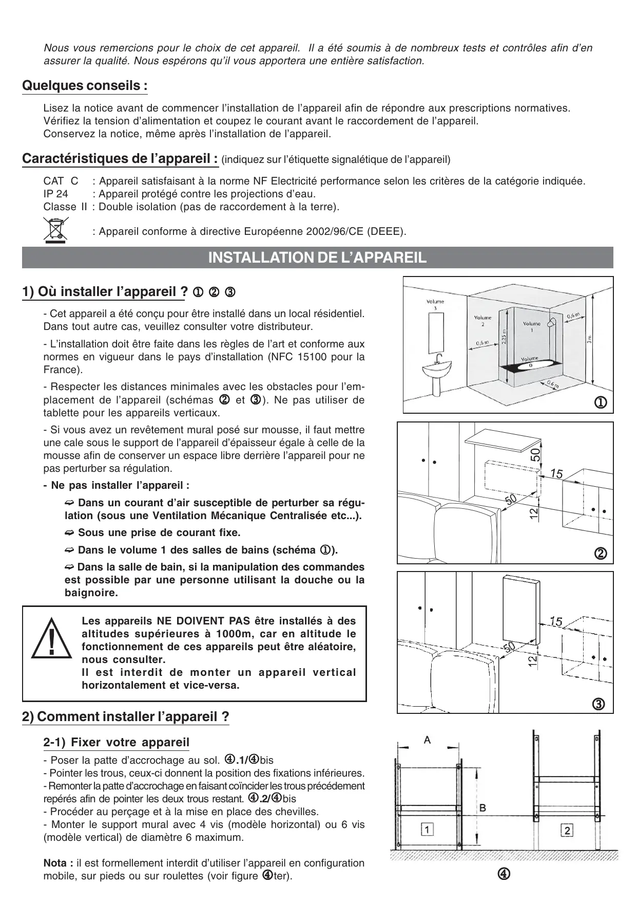 - Si vous avez un revêtement mural posé sur mousse, il faut mettre une cale sous le support de l’appareil d’épaisseur égale à celle de la mousse afin de conserver un espace libre derrière l’appareil pour ne pas perturber sa régulation. - Ne pas installer l’appareil : ➫ Dans un courant d’air susceptible de perturber sa régulation (sous une Ventilation Mécanique Centralisée etc...). ➫ Sous une prise de courant fixe. ➫ Dans le volume 1 des salles de bains (schéma M).