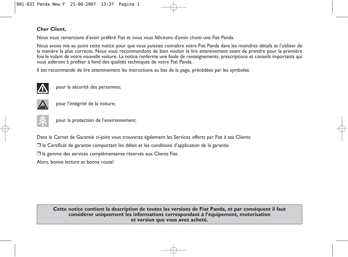 001-031 Panda New F 21-06-2007 13:37 Pagina 1 Cher Client, Nous vous remercions d’avoir préféré Fiat et nous vous félicitons d’avoir choisi une Fiat Panda. Nous avons mis au point cette notice pour que vous puissiez connaître votre Fiat Panda dans les moindres détails et l’utiliser de la manière la plus correcte. Nous vous recommandons de bien vouloir la lire attentivement avant de prendre pour la première fois le volant de votre nouvelle voiture. La notice renferme une foule de renseignements, prescriptions et conseils importants qui vous aideront à profiter à fond des qualités techniques de votre Fiat Panda. Il est recommandé de lire attentivement les instructions au bas de la page, précédées par les symboles: pour la sécurité des personnes; pour l’intégrité de la voiture; pour la protection de l’environnement. Dans le Carnet de Garantie ci-joint vous trouverez également les Services offerts par Fiat à ses Clients: ❒ le Certificat de garantie comportant les délais et les conditions d’application de la garantie ❒ la gamme des services complémentaires réservés aux Clients Fiat. Alors, bonne lecture et bonne route! Cette notice contient la description de toutes les versions de Fiat Panda, et par conséquent il faut considérer uniquement les informations correspondant à l’équipement, motorisation et version que vous avez acheté. 001-031 Panda New F 21-06-2007 13:37 Pagina 2 A LIRE ABSOLUMENT!