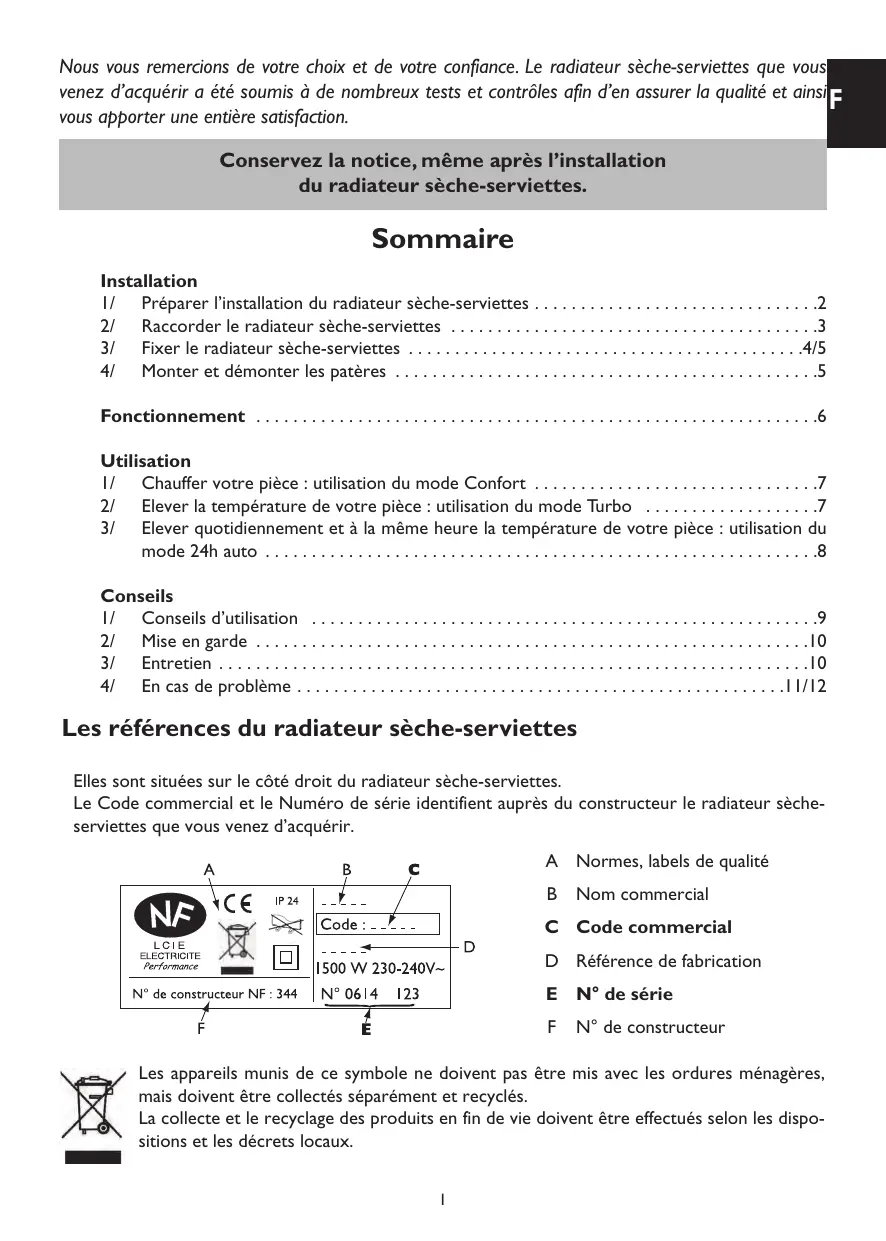 - 4/ En cas de problème /12 Les références du radiateur sèche-serviettes Elles sont situées sur le côté droit du radiateur sèche-serviettes. Le Code commercial et le Numéro de série identifient auprès du constructeur le radiateur sècheserviettes que vous venez d’acquérir. A Normes, labels de qualité p. 11