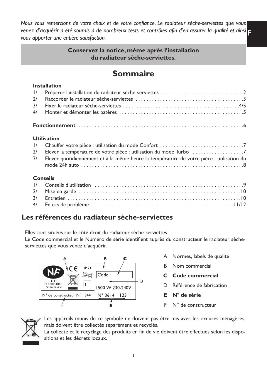 Le Code commercial et le Numéro de série identifient auprès du constructeur le radiateur sècheserviettes que vous venez d’acquérir. A Normes, labels de qualité