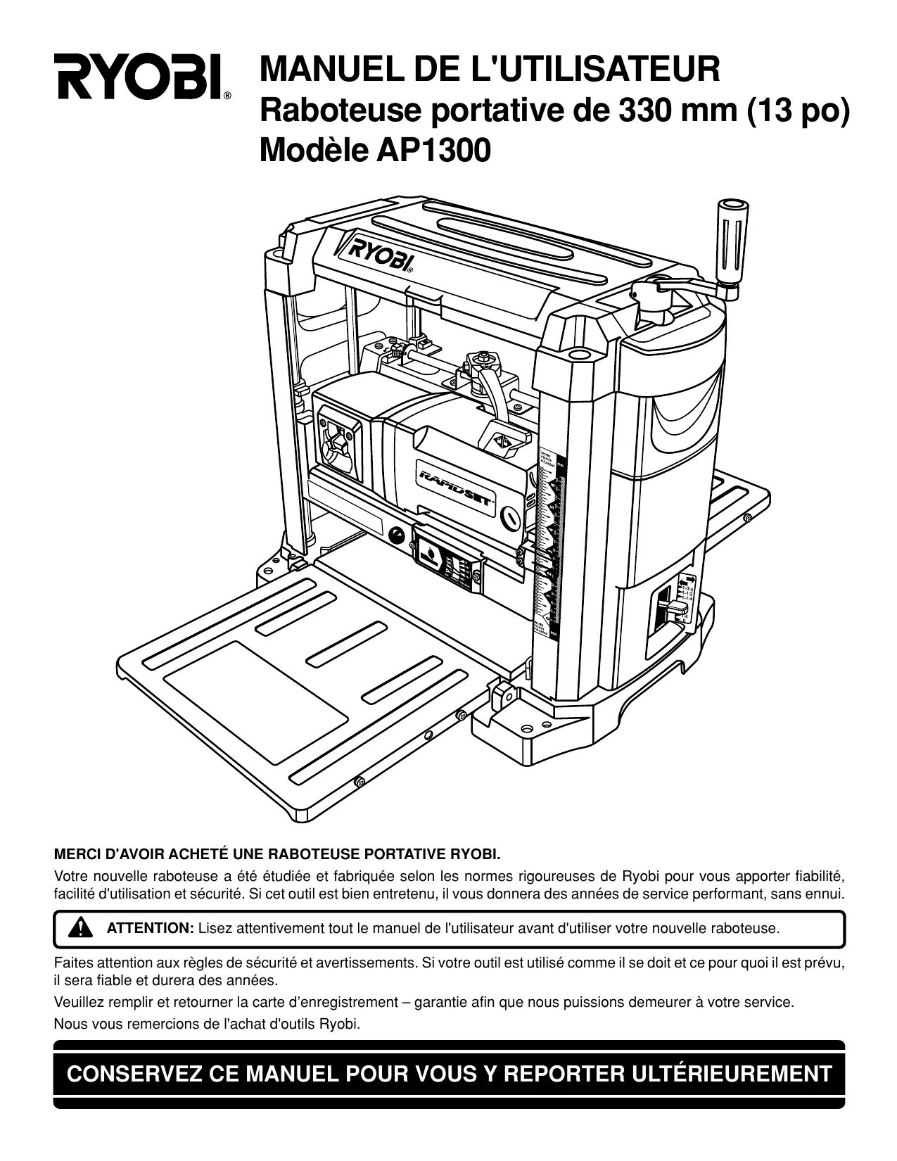 Votre nouvelle raboteuse a etudiee and fabriquee selon les normes rigoureuses de Ryobi pour you apporter fiabilité, facilitd utilisation et securite. Si cet outil est bien entretenu, il you donnera des annes de service performant, sans ennui.
