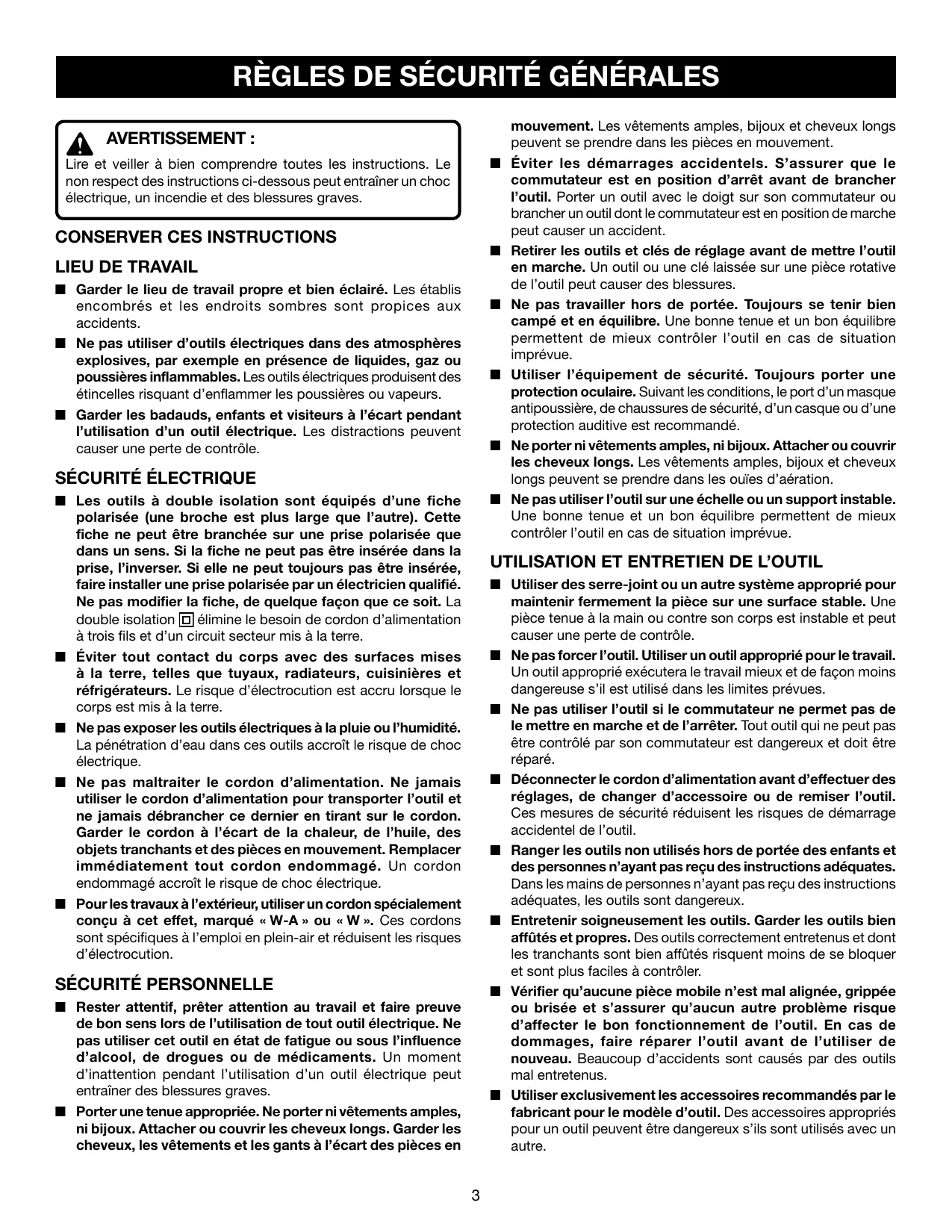 RÈGLES DE SÉCURITÉ GÉNÉRALES DÉPANNAGE n Garder l’outil et sa poignée secs, propres et exempts d’huile ou de graisse. Toujours utiliser un chiffon propre pour le nettoyage. Ne jamais utiliser de liquide de freins, d’essence, de produits à base de pétrole ou de solvants forts pour nettoyer l’outil. Le respect de cette consigne réduira les risques de perte de contrôle et d’endommagement du boîtier en plastique. n Le dépannage des outils doit être confié exclusivement à un personnel qualifié. Les réparations ou entretiens effectués par des personnes non qualifiées présentent des risques de blessures. n Utiliser exclusivement des pièces identiques à celles d’origine pour les réparations. Se conformer aux instructions de la section Entretien de ce manuel. L’usage de pièces non autorisées ou le non respect des instructions peut présenter des risques de choc électrique ou de blessures. RÈGLES DE SÉCURITÉ PARTICULIÈRES n Lorsque l’outil est utilisé pour un travail risquant de le mettre en contact avec des fils électriques cachés ou son propre cordon d’alimentation, le tenir par les surfaces de prise isolées. Tout contact avec un fil sous tension électrifierait les parties métalliques de l’outil, causant une électrocution de l’opérateur. Garder le cordon à l’écart de la chaleur, de l’huile et des objets tranchants. Le respect de cette consigne réduira les risques de choc électrique et d’incendie. n S’assurer que le cordon prolongateur est en bon état. Si un cordon prolongateur est utilisé, s’assurer que sa capacité est suffisante pour supporter le courant de fonctionnement de l’outil. Un calibre de fil (A.W.G) d’au minimum 14 est recommandé pour un cordon prolongateur de 15 m (50 pi) maximum. L’usage d’un cordon de plus de 30 m (100 pi) est déconseillé. En cas de doute, utiliser un cordon du calibre immédiatement supérieur. Moins le numéro de calibre est élevé, plus la capacité du fil est grande. Un cordon de capacité insuffisante causerait une baisse de la tension de ligne, entraînant une perte de puissance et une surchauffe.