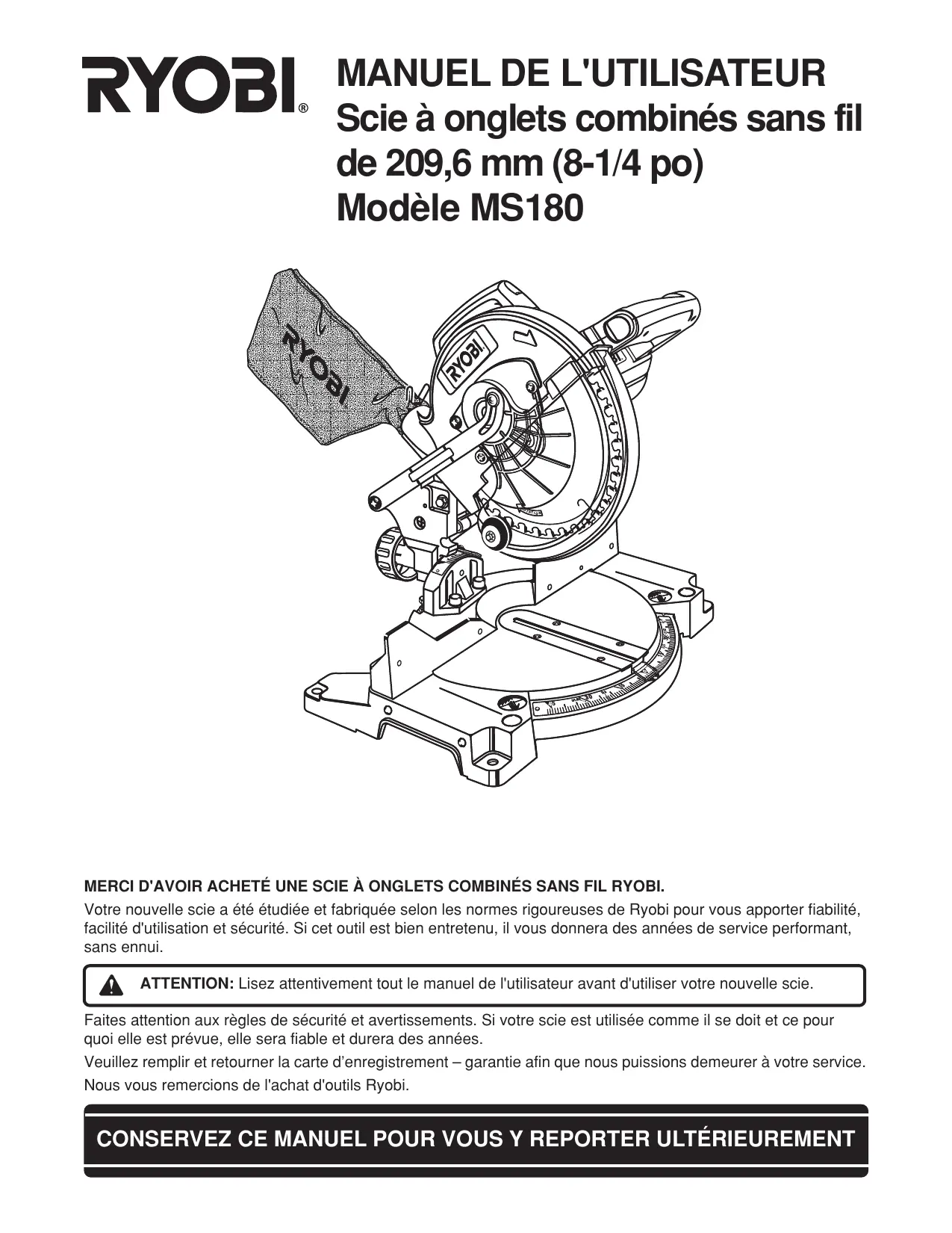 MANUEL DE L'UTILISATEUR Scie à onglets combinés sans fil de 209,6 mm (8-1/4 po) Modèle MS180 Faites attention aux règles de sécurité et avertissements. Si votre scie est utilisée comme il se doit et ce pour quoi elle est prévue, elle sera fiable et durera des années. Veuillez remplir et retourner la carte d’enregistrement – garantie afin que nous puissions demeurer à votre service. Nous vous remercions de l'achat d'outils Ryobi.