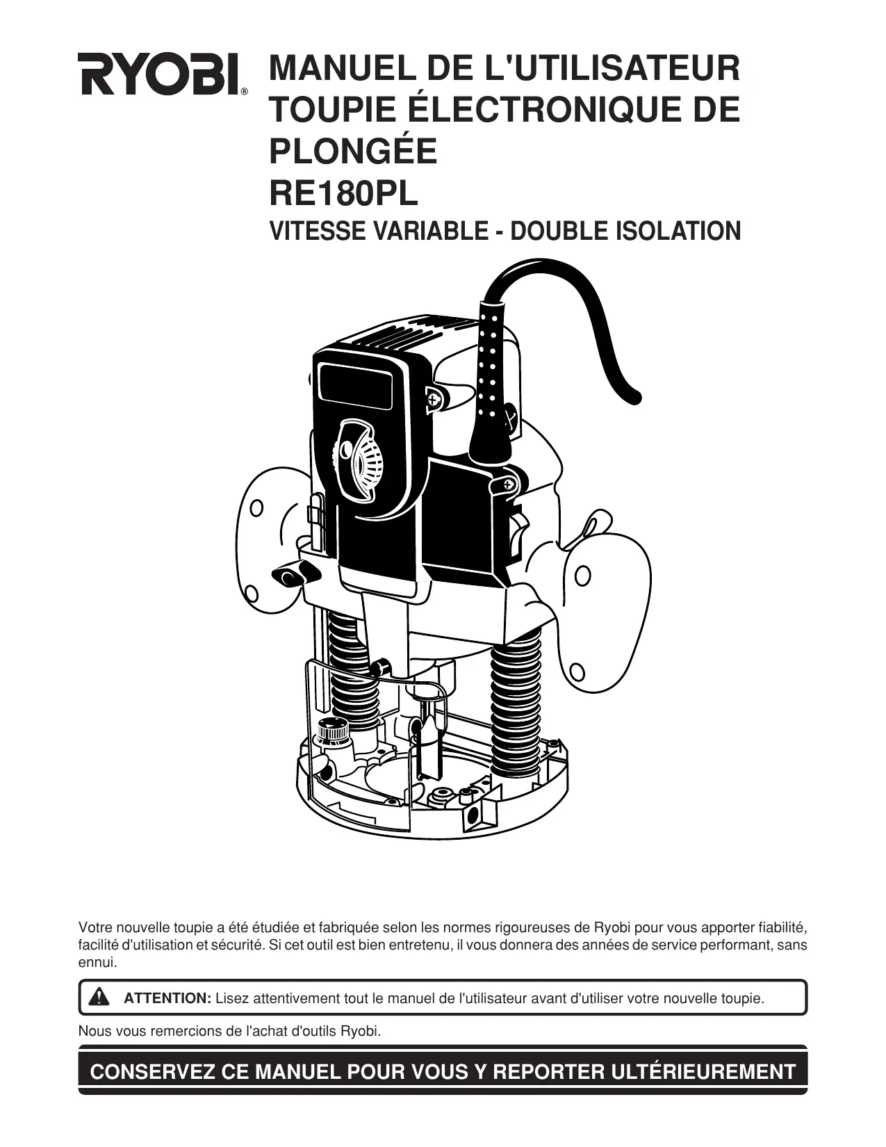 Votre nouvelle toupie a été étudiée et fabriquée selon les normes rigoureuses de Ryobi pour vous apporter fiabilité, facilité d'utilisation et sécurité. Si cet outil est bien entretenu, il vous donnera des années de service performant, sans ennui. ATTENTION: Lisez attentivement tout le manuel de l'utilisateur avant d'utiliser votre nouvelle toupie. Nous vous remercions de l'achat d'outils Ryobi. CONSERVEZ CE MANUEL POUR VOUS Y REPORTER ULTÉRIEUREMENT