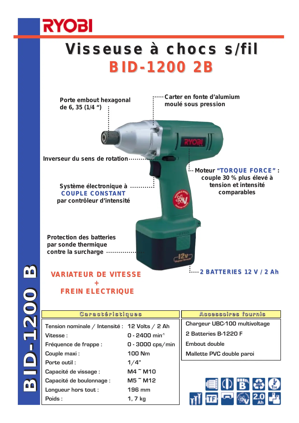 100 Nm 1/4 M4 ~ M10 M5 ~ M12 196 mm 1, 7 kg 2 BATTERIES 12 V / 2 Ah Accessoires fournis Chargeur UBC-100 multivoltage 2 Batteries B-1220 F Embout double Mallette PVC double paroi Pour les professionnels les plus exigeants... PUISSANTE... - Moteur T ORQUE FORCE couple 30 % plus élevé. - Système électronique de couple constant quelle que soit la vitesse. - Couple élevé : 100 Nm. - Batterie de qualité japonaise 12 volts, 2 Ah. RAPIDE... - Outil destiné au vissage en force et à haute cadence : r vitesse : 0 à 2400 min -1 r fréquence de frappe : 0 à 3000 cps / min. - Frein électrique d’arrêt instantané . ROBUSTE... - Carter de pignonnerie en fonte d’alumunium moulé sous pression. - Protection des batteries par sonde thermique contre la surcharge. - Aération - refroidissement du moteur par ventilateur. - Pignonnerie en acier fritté et graissée à vie. - Coque en nylon. PRATIQUE... - Inverseur du sens de rotation. - Variateur de vitesse électronique. - Revêtement anti-dérapant sur la poignée. BID-1200 2B - Machine très compacte, très maniable : r bien équilibrée (forme en “T”), r permet de passer rapidement d’une vis à l’autre.