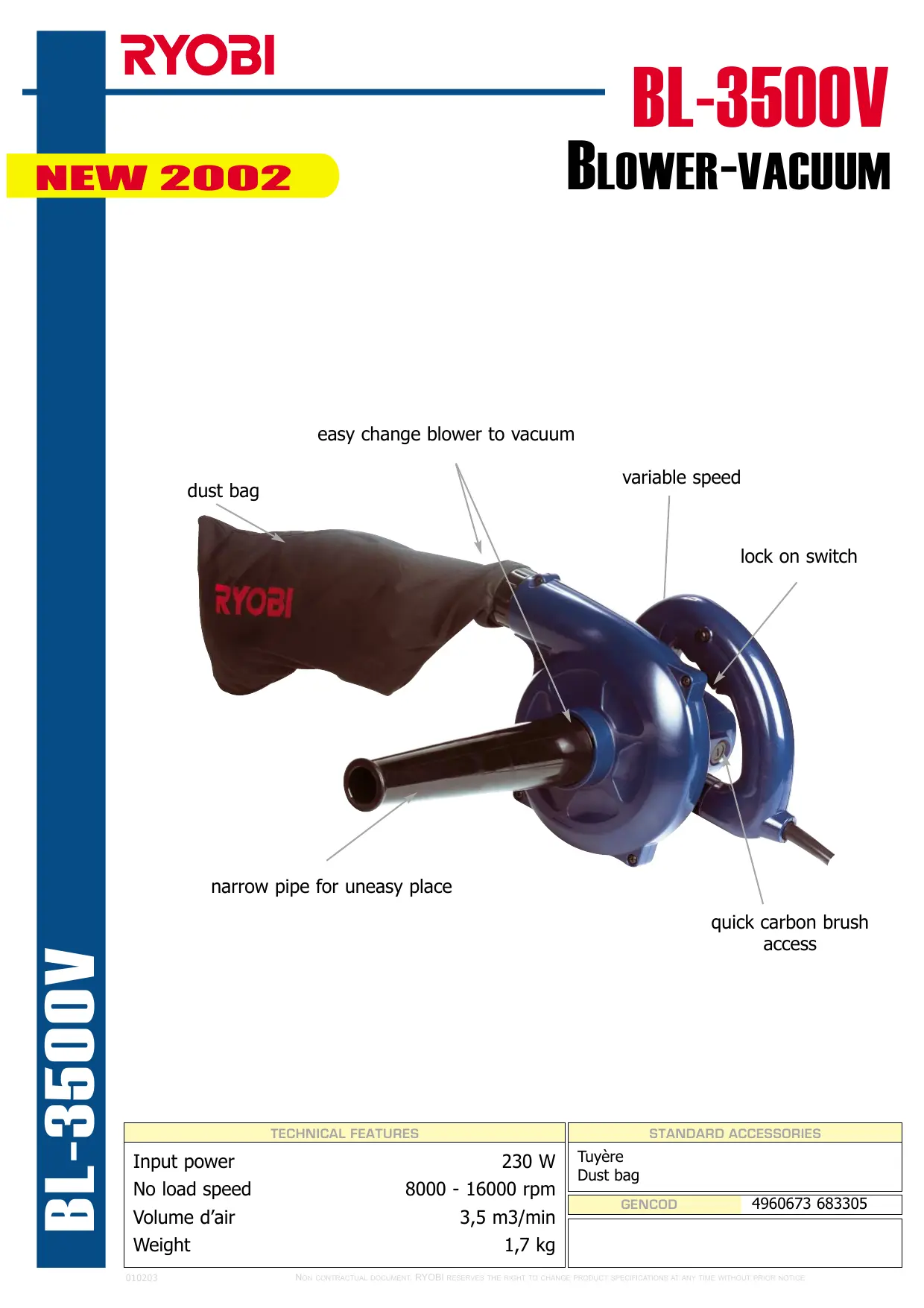 Retrouvez gratuitement la notice de l'appareil BL-3500V RYOBI au format PDF.