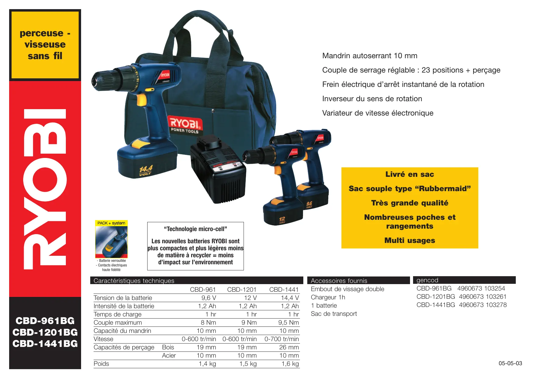 perceuse visseuse sans fil Mandrin autoserrant 10 mm Couple de serrage réglable : 23 positions + perçage Frein électrique d’arrêt instantané de la rotation Inverseur du sens de rotation Variateur de vitesse électronique Livré en sac Sac souple type “Rubbermaid” Très grande qualité Nombreuses poches et rangements PACK + system “Technologie micro-cell” - Batterie verrouillée - Contacts électriques haute fidélité Multi usages Les nouvelles batteries RYOBI sont plus compactes et plus légères moins de matière à recycler = moins d’impact sur l’environnement Caractéristiques techniques CBD-961BG CBD-1201BG CBD-1441BG Tension de la batterie Intensité de la batterie Temps de charge Couple maximum Capacité du mandrin Vitesse Capacités de perçage Poids CBD-961 9,6 V 1,2 Ah 1 hr 8 Nm 10 mm 0-600 tr/min Bois 19 mm Acier 10 mm 1,4 kg CBD-1201 12 V 1,2 Ah 1 hr 9 Nm 10 mm 0-600 tr/min 19 mm 10 mm 1,5 kg CBD-1441 14,4 V 1,2 Ah 1 hr 9,5 Nm 10 mm 0-700 tr/min 26 mm 10 mm 1,6 kg Accessoires fournis Embout de vissage double Chargeur 1h 1 batterie Sac de transport gencod CBD-961BG 4960673 103254 CBD-1201BG 4960673 103261 CBD-1441BG 4960673 103278 05-05-03