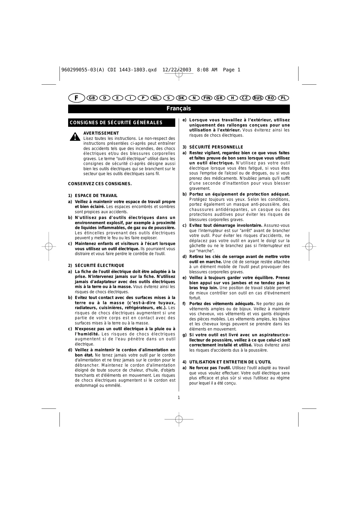 4) UTILISATION ET ENTRETIEN DE L'OUTIL a) Ne forcez pas l'outil. Utilisez l'outil adapté au travail que vous voulez effectuer. Votre outil électrique sera plus efficace et plus sûr si vous l'utilisez au régime pour lequel il a été conçu.