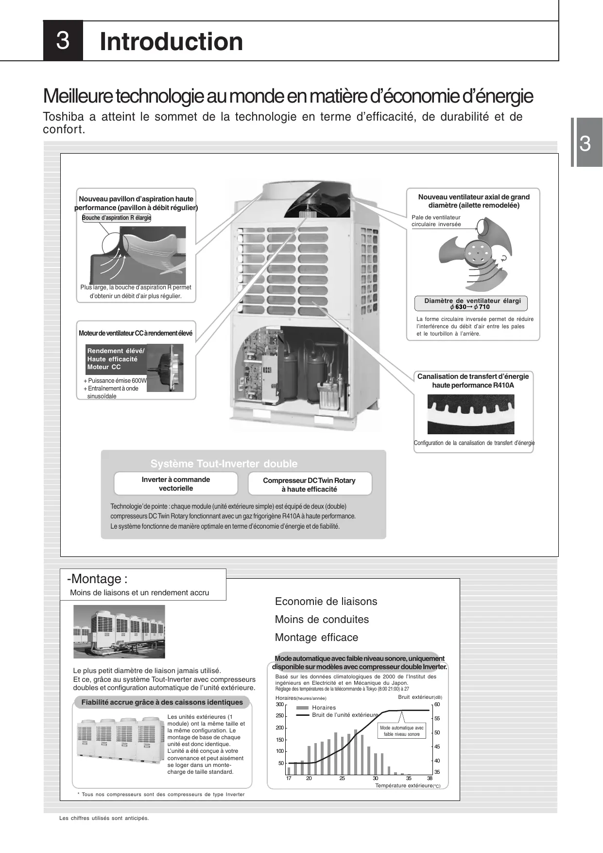 Introduction Avant-propos Meilleuretechnologie au monde en matière d’économie d’énergie Toshiba a atteint le sommet de la technologie en terme d’efficacité, de durabilité et de confort. Nouveau ventilateur axial de grand diamètre (ailette remodelée) Nouveau pavillon d’aspiration haute performance (pavillon à débit régulier) Bouche d’aspiration R élargie Pale de ventilateur circulaire inversée Plus large, la bouche d’aspiration R permet d’obtenir un débit d’air plus régulier. Diamètre de ventilateur élargi La forme circulaire inversée permet de réduire l’interférence du débit d’air entre les pales et le tourbillon à l’arrière. Moteur de ventilateur CC à rendement élevé Rendement élévé/ Haute efficacité Moteur CC Canalisation de transfert d’énergie haute performance R410A + Puissance émise 600W + Entraînement à onde sinusoïdale Configuration de la canalisation de transfert d’énergie Système Tout-Inverter double Inverter à commande vectorielle Compresseur DC Twin Rotary à haute efficacité