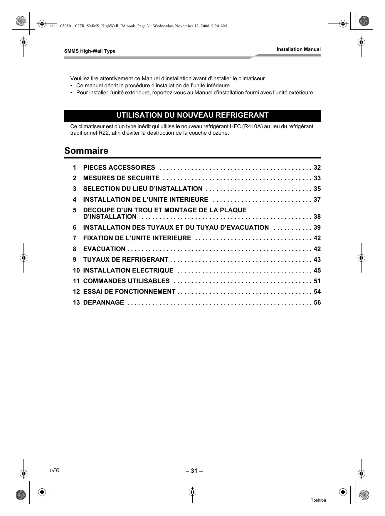 d _4e 7 +1Ti1050501_02FR_SMMS_HighWall_IMbook Page 31 Wednesday, November 12, 2008 9:24 AM SA SMMS High-Wall Type Installation Manual Veuillez lire attentivement ce Manuel d'installation avant d'installer le climatiseur. + Ce manuel décrit la procédure d'installation de l'unité intérieure. +_ Pourinstaller l'unité extérieure, reportez-vous au Manuel d'installation fourni avec l'unité extérieure.