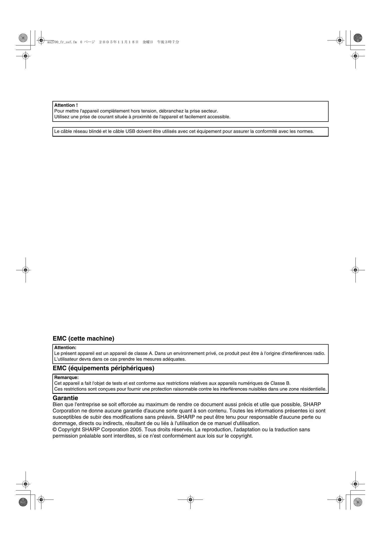 © Copyright SHARP Corporation 2005. Tous droits réservés. La reproduction, l'adaptation ou la traduction sans permission préalable sont interdites, si ce n'est conformément aux lois sur le copyright.