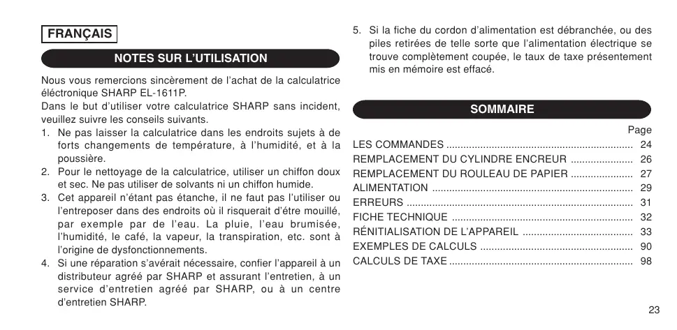 FRANÇAIS NOTES SUR L’UTILISATION Nous vous remercions sincèrement de l’achat de la calculatrice éléctronique SHARP EL-1611P. Dans le but d’utiliser votre calculatrice SHARP sans incident, veuillez suivre les conseils suivants. 1. Ne pas laisser la calculatrice dans les endroits sujets à de forts changements de température, à l’humidité, et à la poussière. 2. Pour le nettoyage de la calculatrice, utiliser un chiffon doux et sec. Ne pas utiliser de solvants ni un chiffon humide. 3. Cet appareil n’étant pas étanche, il ne faut pas l’utiliser ou l’entreposer dans des endroits où il risquerait d’étre mouillé, par exemple par de l’eau. La pluie, l’eau brumisée, l’humidité, le café, la vapeur, la transpiration, etc. sont à l’origine de dysfonctionnements. 4. Si une réparation s’avérait nécessaire, confier l’appareil à un distributeur agréé par SHARP et assurant l’entretien, à un service d’entretien agréé par SHARP, ou à un centre d’entretien SHARP.