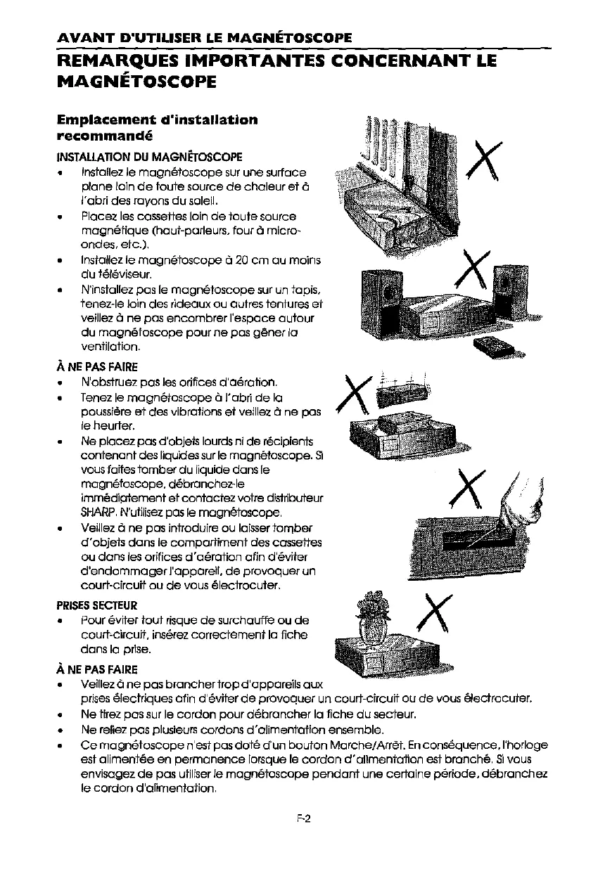 N'obstruez pas les orifices d'aeration. Tenez Ie magnetoscope l'abri de 10 poussiere at des vibrations ef veillez ne pas Ie heurter. Ne ploeez pas d'objets lourds ni de recipients contenant des Ilqudes sur Ie magnetoscope. 5'1 vous faites tomber du liquide dans Ie magnetoscope. debranchez-Ie immediotement et contactez vatre distribvteur SHARP, N'utilisez pas Ie magnetascope. Veillez ne pas introduire au laisser tomber d'objets dans Ie campartiment des cassettes ou dans les orffices d'aeratian afin d'eviter d'endommager J'apporeil. de provoquer un court-circuit ou de vous electrocuter,