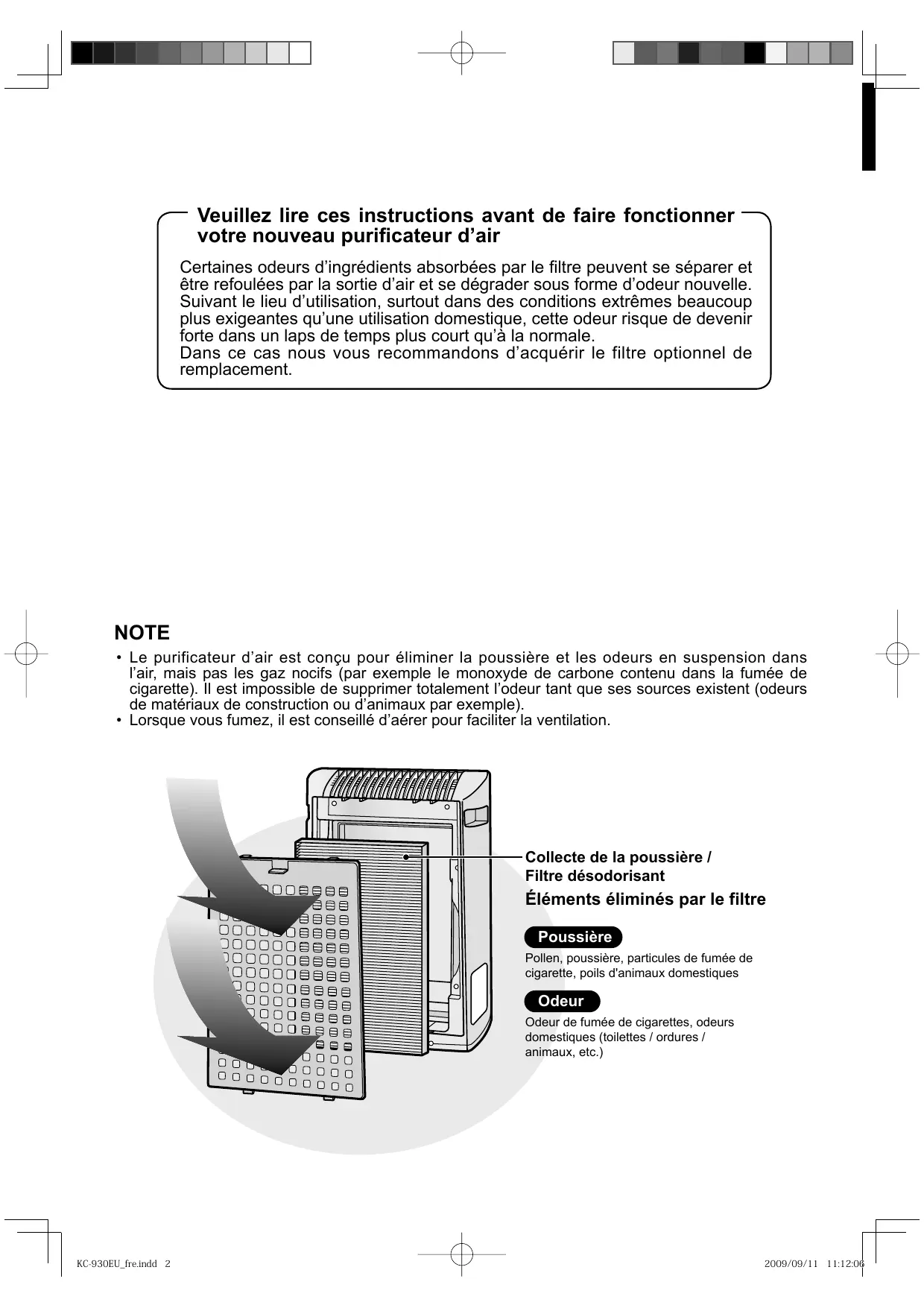 NOTE Le purificateur d’air est conçu pour éliminer la poussière et les odeurs en suspension dans L l'air, mais pas les gaz nocifs (par exemple le monoxyde de carbone contenu dans la fumée de