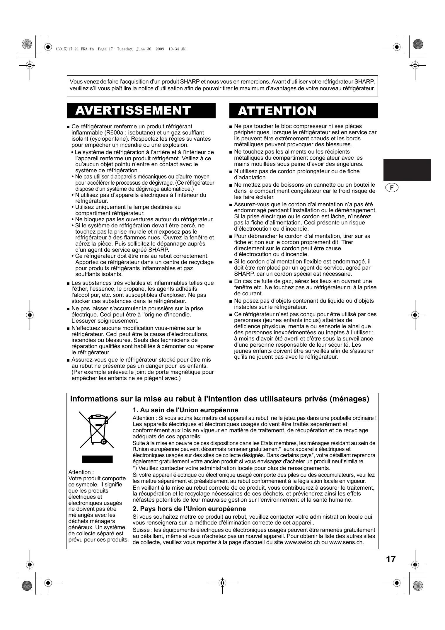 Ne pas toucher le bloc compresseur ni ses pièces périphériques, lorsque le réfrigérateur est en service car ils peuvent être extrêmement chauds et les bords métalliques peuvent provoquer des blessures. Ne touchez pas les aliments ou les récipients métalliques du compartiment congélateur avec les mains mouillées sous peine d’avoir des engelures. N’utilisez pas de cordon prolongateur ou de fiche d’adaptation. Ne mettez pas de boissons en cannette ou en bouteille dans le compartiment congélateur car le froid risque de les faire éclater. Assurez-vous que le cordon d'alimentation n’a pas été endommagé pendant l’installation ou le déménagement. Si la prise électrique ou le cordon est lâche, n’insérez pas la fiche d’alimentation. Ceci présente un risque d’électrocution ou d’incendie. Pour débrancher le cordon d’alimentation, tirer sur sa fiche et non sur le cordon proprement dit. Tirer directement sur le cordon peut être cause d’électrocution ou d’incendie. Si le cordon d’alimentation flexible est endommagé, il doit être remplacé par un agent de service, agréé par SHARP, car un cordon spécial est nécessaire. En cas de fuite de gaz, aérez les lieux en ouvrant une fenêtre etc. Ne touchez pas au réfrigérateur ni à la prise de courant. Ne posez pas d’objets contenant du liquide ou d’objets instables sur le réfrigérateur. Ce réfrigérateur n’est pas conçu pour être utilisé par des personnes (jeunes enfants inclus) atteintes de déficience physique, mentale ou sensorielle ainsi que des personnes inexpérimentées ou inaptes à l’utiliser ; à moins d’avoir été averti et d’être sous la surveillance d’une personne responsable de leur sécurité. Les jeunes enfants doivent être surveillés afin de s’assurer qu’ils ne jouent pas avec le réfrigérateur. Informations sur la mise au rebut à l'intention des utilisateurs privés (ménages)