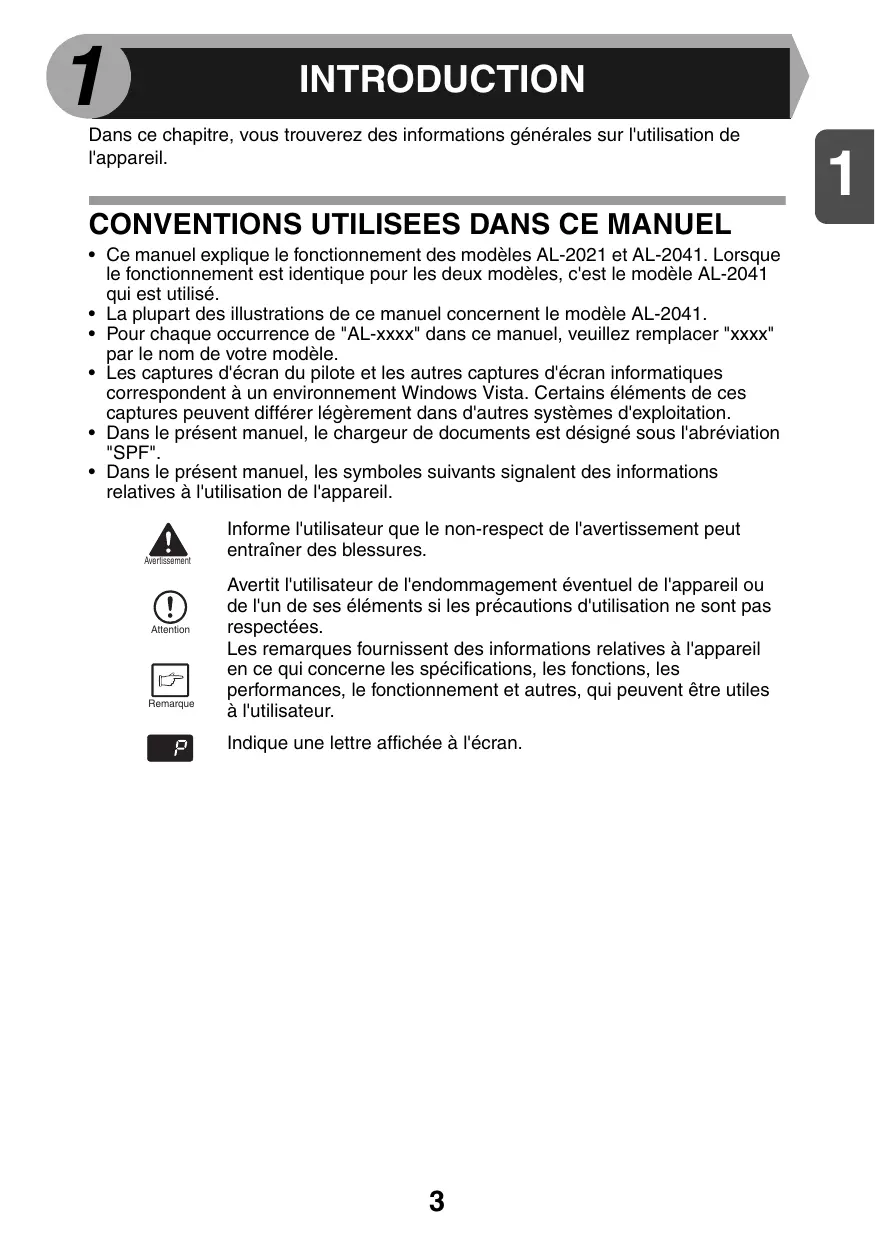 Ce manuel explique le fonctionnement des modèles AL-2021 et AL-2041. Lorsque le fonctionnement est identique pour les deux modèles, c'est le modèle AL-2041 qui est utilisé. La plupart des illustrations de ce manuel concernent le modèle AL-2041. Pour chaque occurrence de "AL-xxxx" dans ce manuel, veuillez remplacer "xxxx" par le nom de votre modèle. Les captures d'écran du pilote et les autres captures d'écran informatiques correspondent à un environnement Windows Vista. Certains éléments de ces captures peuvent différer légèrement dans d'autres systèmes d'exploitation. Dans le présent manuel, le chargeur de documents est désigné sous l'abréviation "SPF". Dans le présent manuel, les symboles suivants signalent des informations relatives à l'utilisation de l'appareil. Informe l'utilisateur que le non-respect de l'avertissement peut entraîner des blessures. same Avertit l'utilisateur de l'endommagement éventuel de l'appareil ou de l'un de ses éléments si les précautions d'utilisation ne sont pas Ation respectées. Les remarques fournissent des informations relatives à l'appareil en ce qui concerne les spécifications, les fonctions, les performances, le fonctionnement et autres, qui peuvent être utiles à l'utilisateur. | ?] Indique une lettre affichée à l'écran. Femaque