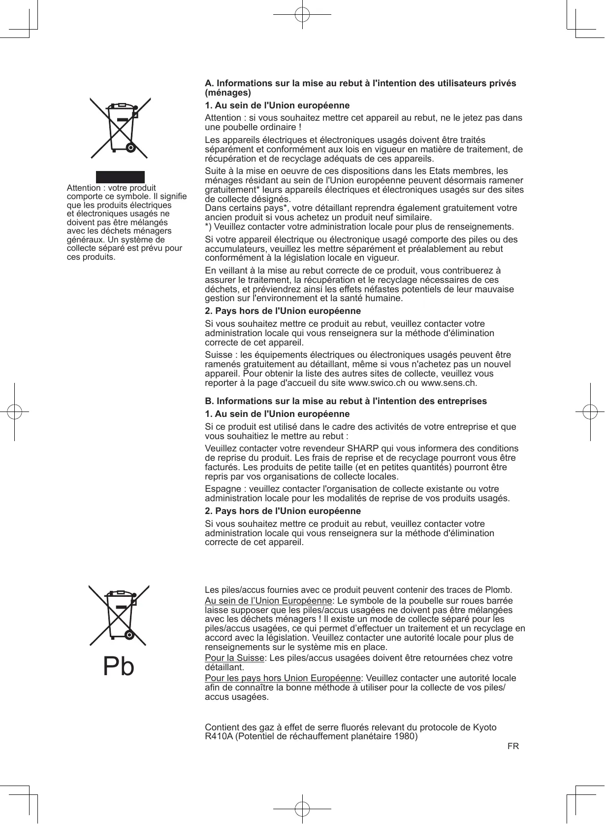 Les piles/accus fournies avec ce produit peuvent contenir des traces de Plomb. Au sein de l’Union Européenne: Le symbole de la poubelle sur roues barrée laisse supposer que les piles/accus usagées ne doivent pas être mélangées avec les déchets ménagers ! Il existe un mode de collecte séparé pour les piles/accus usagées, ce qui permet d’effectuer un traitement et un recyclage en accord avec la législation. Veuillez contacter une autorité locale pour plus de renseignements sur le système mis en place. Pour la Suisse: Les piles/accus usagées doivent être retournées chez votre détaillant. Pour les pays hors Union Européenne: Veuillez contacter une autorité locale afin de connaître la bonne méthode à utiliser pour la collecte de vos piles/ accus usagées. Contient des gaz à effet de serre fluorés relevant du protocole de Kyoto R410A (Potentiel de réchauffement planétaire 1980)