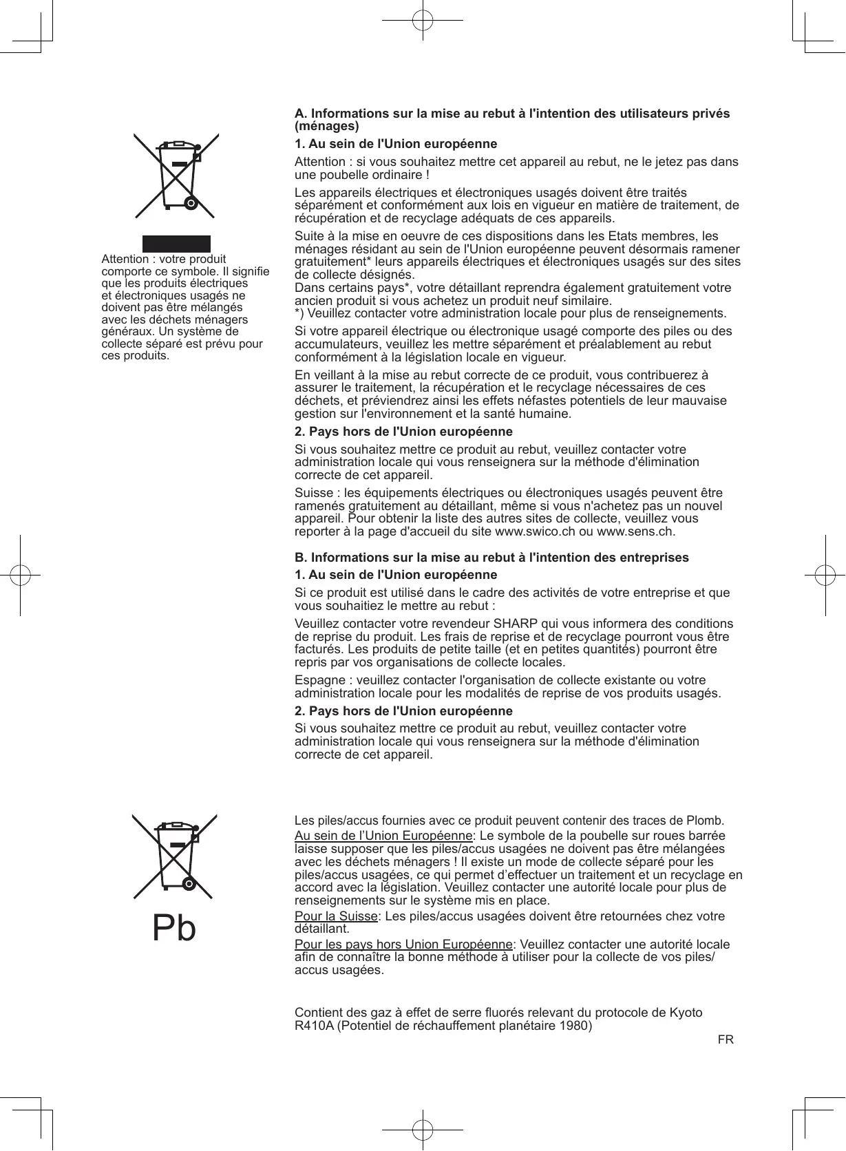 A. Informations sur la mise au rebut à l'intention des utilisateurs privés (ménages) 1. Au sein de l'Union européenne Attention : si vous souhaitez mettre cet appareil au rebut, ne le jetez pas dans une poubelle ordinaire ! Les appareils électriques et électroniques usagés doivent être traités séparément et conformément aux lois en vigueur en matière de traitement, de récupération et de recyclage adéquats de ces appareils. Suite à la mise en oeuvre de ces dispositions dans les Etats membres, les ménages résidant au sein de l'Union européenne peuvent désormais ramener gratuitement* leurs appareils électriques et électroniques usagés sur des sites de collecte désignés. Dans certains pays*, votre détaillant reprendra également gratuitement votre ancien produit si vous achetez un produit neuf similaire. *) Veuillez contacter votre administration locale pour plus de renseignements. Si votre appareil électrique ou électronique usagé comporte des piles ou des accumulateurs, veuillez les mettre séparément et préalablement au rebut conformément à la législation locale en vigueur. En veillant à la mise au rebut correcte de ce produit, vous contribuerez à assurer le traitement, la récupération et le recyclage nécessaires de ces déchets, et préviendrez ainsi les effets néfastes potentiels de leur mauvaise gestion sur l'environnement et la santé humaine. 2. Pays hors de l'Union européenne Si vous souhaitez mettre ce produit au rebut, veuillez contacter votre administration locale qui vous renseignera sur la méthode d'élimination correcte de cet appareil. Suisse : les équipements électriques ou électroniques usagés peuvent être ramenés gratuitement au détaillant, même si vous n'achetez pas un nouvel appareil. Pour obtenir la liste des autres sites de collecte, veuillez vous reporter à la page d'accueil du site www.swico.ch ou www.sens.ch. B. Informations sur la mise au rebut à l'intention des entreprises 1. Au sein de l'Union européenne Si ce produit est utilisé dans le cadre des activités de votre entreprise et que vous souhaitiez le mettre au rebut : Veuillez contacter votre revendeur SHARP qui vous informera des conditions de reprise du produit. Les frais de reprise et de recyclage pourront vous être facturés. Les produits de petite taille (et en petites quantités) pourront être repris par vos organisations de collecte locales. Espagne : veuillez contacter l'organisation de collecte existante ou votre administration locale pour les modalités de reprise de vos produits usagés. 2. Pays hors de l'Union européenne Si vous souhaitez mettre ce produit au rebut, veuillez contacter votre administration locale qui vous renseignera sur la méthode d'élimination correcte de cet appareil.