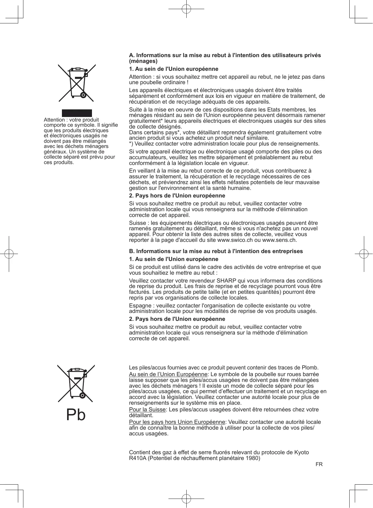 A. Informations sur la mise au rebut à l'intention des utilisateurs privés (ménages) 1. Au sein de l'Union européenne Attention : si vous souhaitez mettre cet appareil au rebut, ne le jetez pas dans une poubelle ordinaire ! Les appareils électriques et électroniques usagés doivent être traités séparément et conformément aux lois en vigueur en matière de traitement, de récupération et de recyclage adéquats de ces appareils. Suite à la mise en oeuvre de ces dispositions dans les Etats membres, les ménages résidant au sein de l'Union européenne peuvent désormais ramener gratuitement* leurs appareils électriques et électroniques usagés sur des sites de collecte désignés. Dans certains pays*, votre détaillant reprendra également gratuitement votre ancien produit si vous achetez un produit neuf similaire. *) Veuillez contacter votre administration locale pour plus de renseignements. Si votre appareil électrique ou électronique usagé comporte des piles ou des accumulateurs, veuillez les mettre séparément et préalablement au rebut conformément à la législation locale en vigueur. En veillant à la mise au rebut correcte de ce produit, vous contribuerez à assurer le traitement, la récupération et le recyclage nécessaires de ces déchets, et préviendrez ainsi les effets néfastes potentiels de leur mauvaise gestion sur l'environnement et la santé humaine. 2. Pays hors de l'Union européenne Si vous souhaitez mettre ce produit au rebut, veuillez contacter votre administration locale qui vous renseignera sur la méthode d'élimination correcte de cet appareil. Suisse : les équipements électriques ou électroniques usagés peuvent être ramenés gratuitement au détaillant, même si vous n'achetez pas un nouvel appareil. Pour obtenir la liste des autres sites de collecte, veuillez vous reporter à la page d'accueil du site www.swico.ch ou www.sens.ch. B. Informations sur la mise au rebut à l'intention des entreprises 1. Au sein de l'Union européenne Si ce produit est utilisé dans le cadre des activités de votre entreprise et que vous souhaitiez le mettre au rebut : Veuillez contacter votre revendeur SHARP qui vous informera des conditions de reprise du produit. Les frais de reprise et de recyclage pourront vous être facturés. Les produits de petite taille (et en petites quantités) pourront être repris par vos organisations de collecte locales. Espagne : veuillez contacter l'organisation de collecte existante ou votre administration locale pour les modalités de reprise de vos produits usagés. 2. Pays hors de l'Union européenne Si vous souhaitez mettre ce produit au rebut, veuillez contacter votre administration locale qui vous renseignera sur la méthode d'élimination correcte de cet appareil.