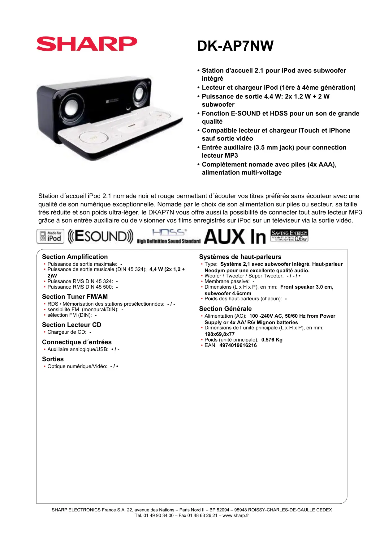 DK-AP7NW - Station d'accueil audio SHARP - Notice d'utilisation et mode d'emploi gratuit