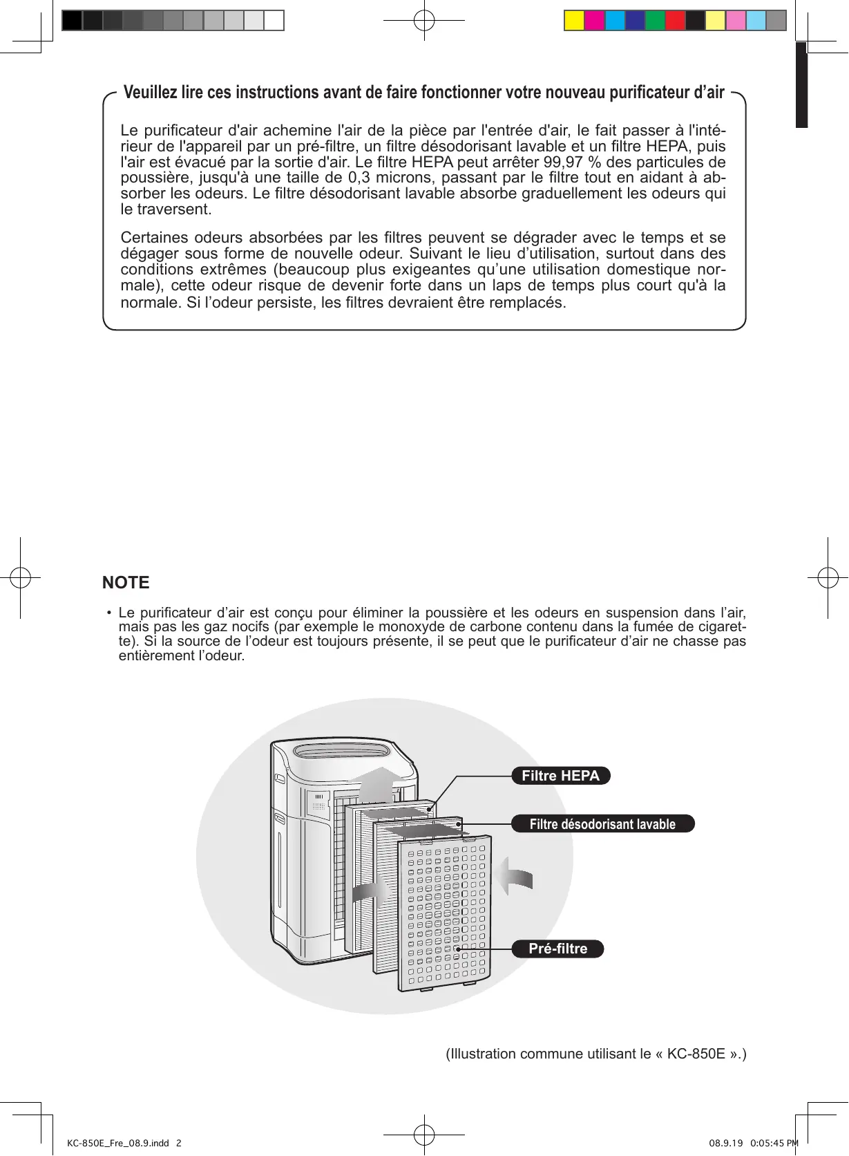 08.9.19 0:06:16 PM GUIDE DE REMPLACEMENT DES FILTRES La durée de vie des filtres varie selon les conditions ambiantes, l’emploi et l’emplacement de l’appareil. Si la poussière ou les odeurs persistent, remplacez les filtres. (Reportez-vous à « Veuillez lire ces instructions avant de faire fonctionner votre nouveau purificateur d’ air ».)
