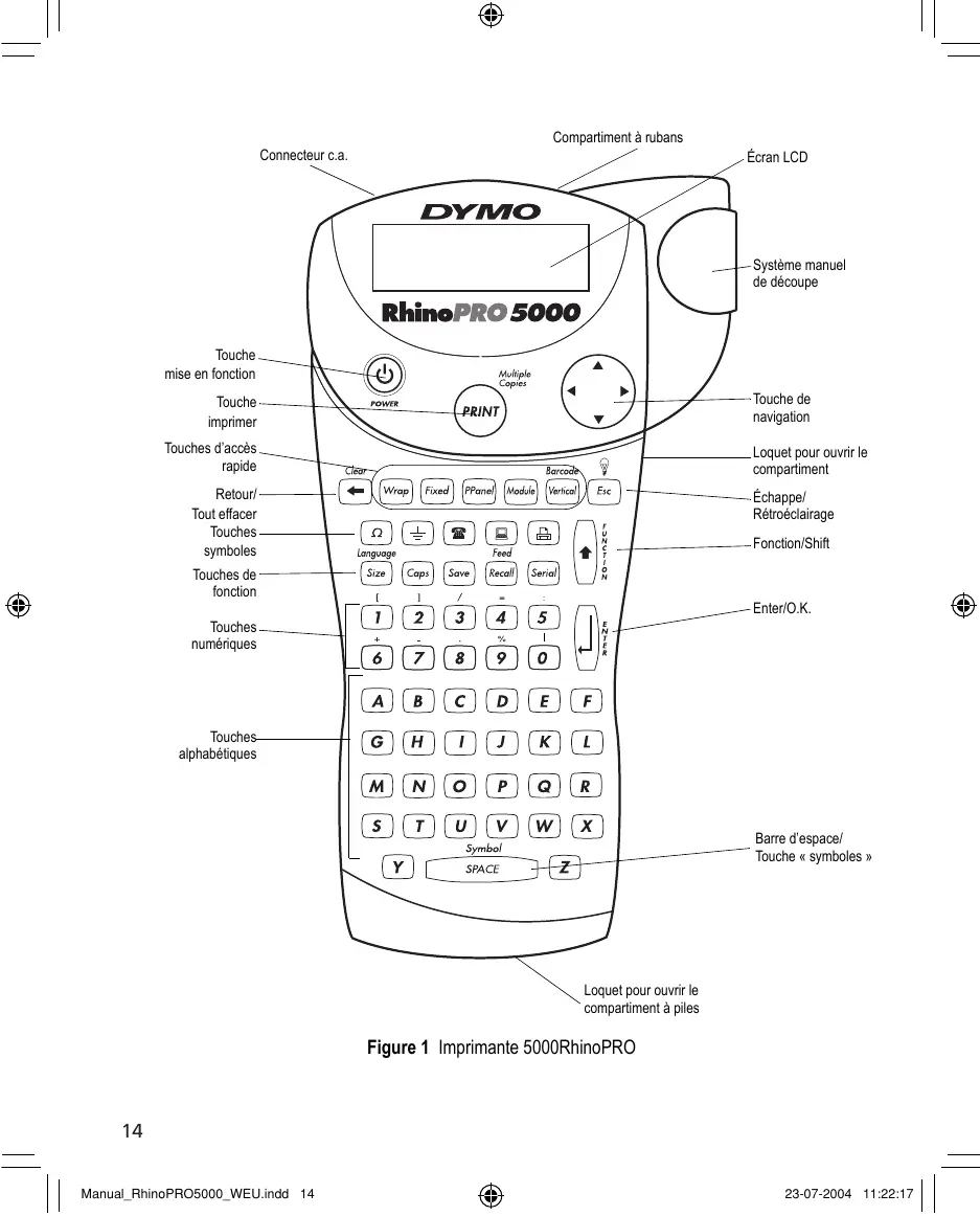 Seite 40 www.dymo.com Manual_RhinoPRO5000_WEU.indd 1 23-07-2004 10:51:00 Connecteur c.a. Compartiment à rubans Écran LCD Système manuel de découpe Touche mise en fonction Touche de navigation Touche imprimer Touches d’accès rapide Loquet pour ouvrir le compartiment Retour/ Tout effacer Touches symboles Échappe/ Rétroéclairage Fonction/Shift Touches de fonction Enter/O.K. Touches numériques Touches alphabétiques Barre d’espace/ Touche « symboles » Loquet pour ouvrir le compartiment à piles Figure 1 Imprimante 5000RhinoPRO