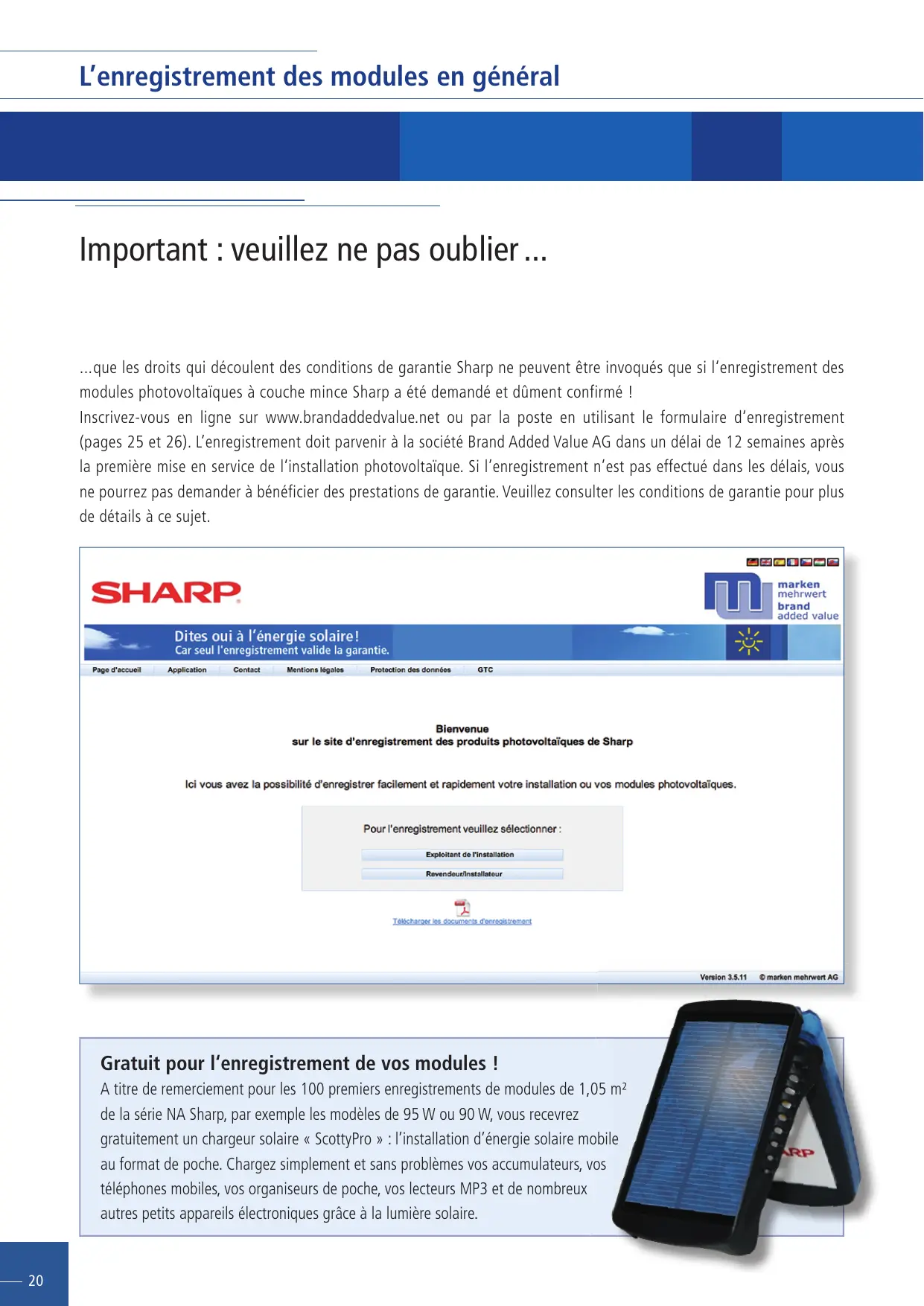 A titre de remerciement pour les 100 premiers enregistements de modules de 1,05m^2 de la série NA Sharp, par exemple les modèles de 95 W ou 90 W, vous receivez Gratisement un chargeur solaire « ScottyPro » : l'installation d'énergie solaire mobile au format de poche. Chargez simplement et sans problèmes vos accumulateurs, vos téléphones mobiles, vos organiseurs de poche, vos lecteurs MP3 et de nombreux autres petits appar兼s électroniques grâce à la lumière solaire.