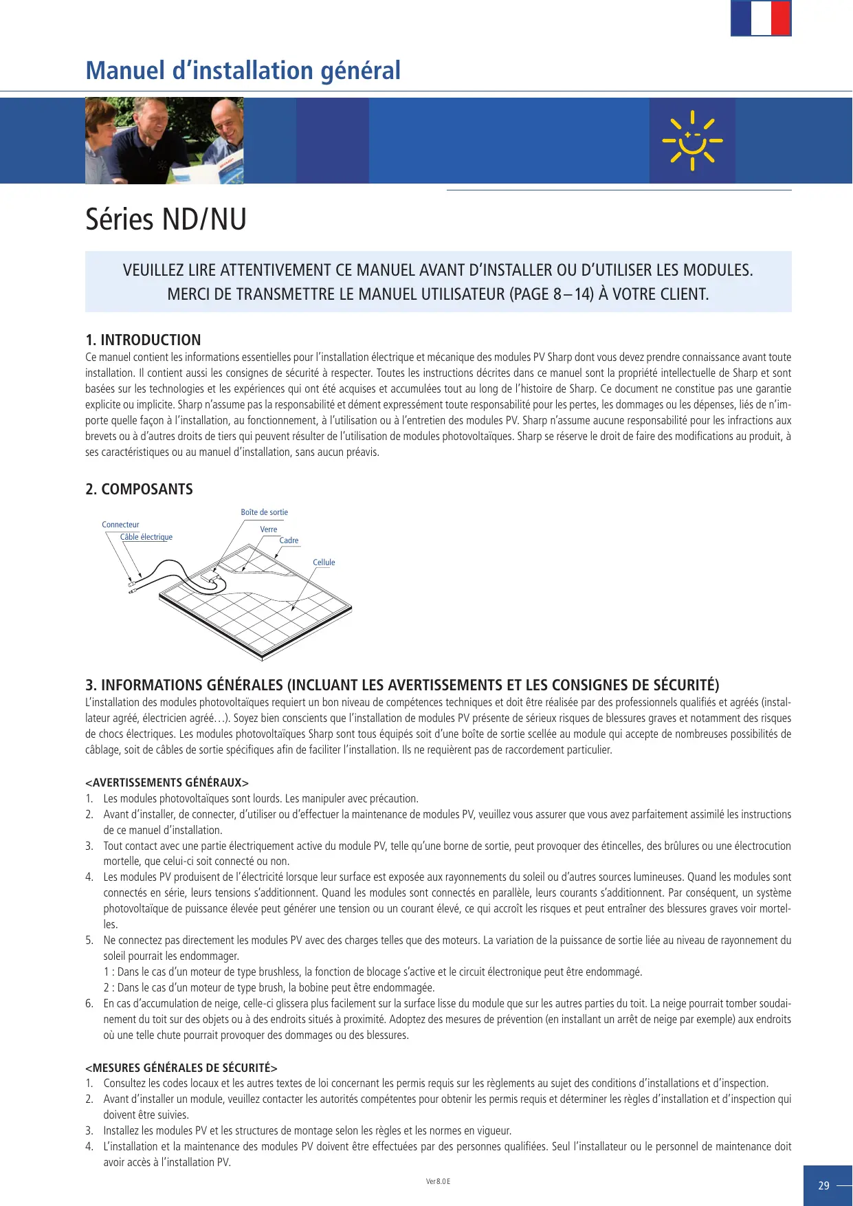 Ce manuel contient les informations essentielles pour l’installation électrique et mécanique des modules PV Sharp dont vous devez prendre connaissance avant toute installation. Il contient aussi les consignes de sécurité à respecter. Toutes les instructions décrites dans ce manuel sont la propriété intellectuelle de Sharp et sont basées sur les technologies et les expériences qui ont été acquises et accumulées tout au long de l’histoire de Sharp. Ce document ne constitue pas une garantie explicite ou implicite. Sharp n’assume pas la responsabilité et dément expressément toute responsabilité pour les pertes, les dommages ou les dépenses, liés de n’importe quelle façon à l’installation, au fonctionnement, à l’utilisation ou à l’entretien des modules PV. Sharp n’assume aucune responsabilité pour les infractions aux brevets ou à d’autres droits de tiers qui peuvent résulter de l’utilisation de modules photovoltaïques. Sharp se réserve le droit de faire des modifications au produit, à ses caractéristiques ou au manuel d’installation, sans aucun préavis.