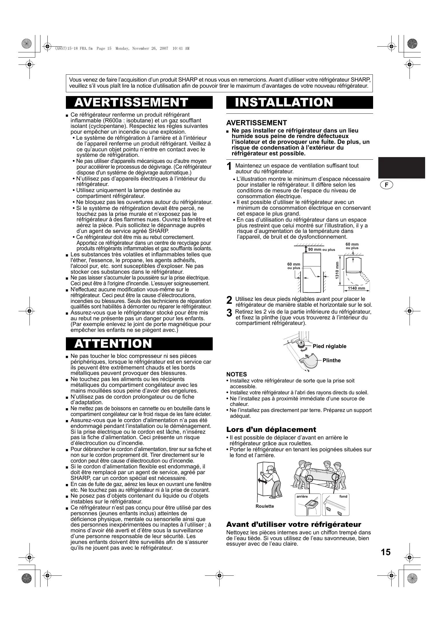 Vous venez de faire l’acquisition d’un produit SHARP et nous vous en remercions. Avant d’utiliser votre réfrigérateur SHARP, veuillez s’il vous plaît lire la notice d’utilisation afin de pouvoir tirer le maximum d’avantages de votre nouveau réfrigérateur.