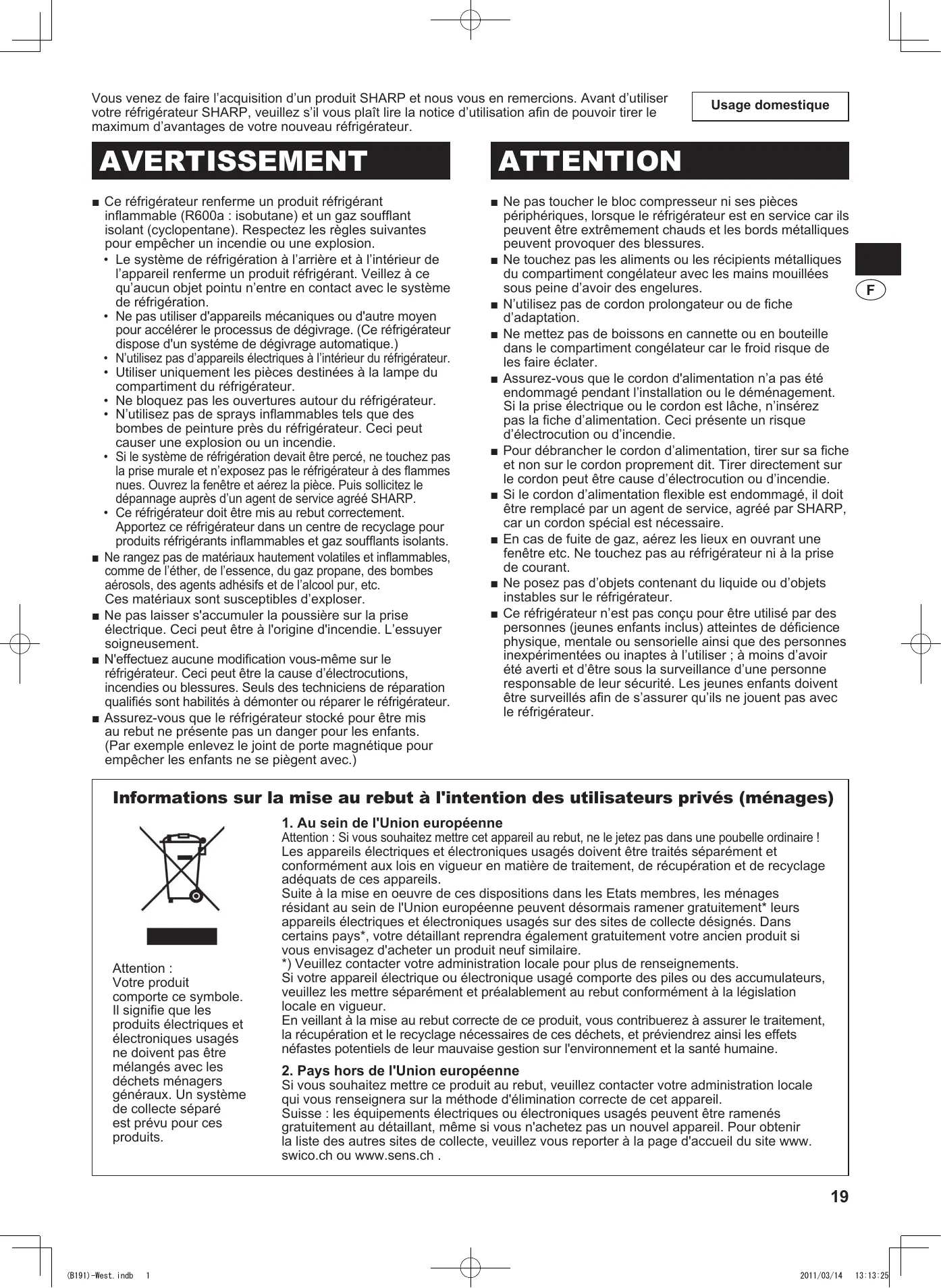 • La comida debe ser fresca. • Congele la comida en porciones pequeñas para congelarla más rápido. Los alimentos en el compartimiento • ¿El frigorífico ha estado trabajando por mucho tiempo con el control de temp. del frigorífico se congelan. establecido en MAX? • Una temperatura ambiente baja puede hacer que la comida se congele aunque tenga el control de temperatura del frigorífico ajustado a MIN. Existen olores en el compartimiento. • Se deben envolver los alimentos con olores fuertes. • La unidad de desodorización no puede eliminar todos los olores. La alarma de la puerta no se • Si no se suspende la alarma de la puerta después de cerrarla, es un defecto. Póngase suspende. en contacto con el centro de servicio de Sharp para solucionar el problema. Método para suspender la alarma de la puerta temporalmente . Ajuste al mismo tiempo los botones para el control de temp. de acuerdo a los pasos siguientes. 3 3 • Le système de réfrigération à l’arrière et à l’intérieur de l’appareil renferme un produit réfrigérant. Veillez à ce qu’aucun objet pointu n’entre en contact avec le système de réfrigération. • Ne pas utiliser d'appareils mécaniques ou d'autre moyen pour accélérer le processus de dégivrage. (Ce réfrigérateur dispose d'un systéme de dégivrage automatique.) • N’utilisez pas d’appareils électriques à l’intérieur du réfrigérateur. • Utiliser uniquement les pièces destinées à la lampe du compartiment du réfrigérateur. • Ne bloquez pas les ouvertures autour du réfrigérateur. • N’utilisez pas de sprays inflammables tels que des bombes de peinture près du réfrigérateur. Ceci peut causer une explosion ou un incendie. • Si le système de réfrigération devait être percé, ne touchez pas la prise murale et n’exposez pas le réfrigérateur à des flammes nues. Ouvrez la fenêtre et aérez la pièce. Puis sollicitez le dépannage auprès d’un agent de service agréé SHARP. • Ce réfrigérateur doit être mis au rebut correctement. Apportez ce réfrigérateur dans un centre de recyclage pour produits réfrigérants inflammables et gaz soufflants isolants. ■ Ne rangez pas de matériaux hautement volatiles et inflammables, comme de l’éther, de l’essence, du gaz propane, des bombes aérosols, des agents adhésifs et de l’alcool pur, etc. Ces matériaux sont susceptibles d’exploser. ■ Ne pas laisser s'accumuler la poussière sur la prise électrique. Ceci peut être à l'origine d'incendie. L’essuyer soigneusement. ■ N'effectuez aucune modification vous-même sur le réfrigérateur. Ceci peut être la cause d’électrocutions, incendies ou blessures. Seuls des techniciens de réparation qualifiés sont habilités à démonter ou réparer le réfrigérateur. ■ Assurez-vous que le réfrigérateur stocké pour être mis au rebut ne présente pas un danger pour les enfants. (Par exemple enlevez le joint de porte magnétique pour empêcher les enfants ne se piègent avec.)