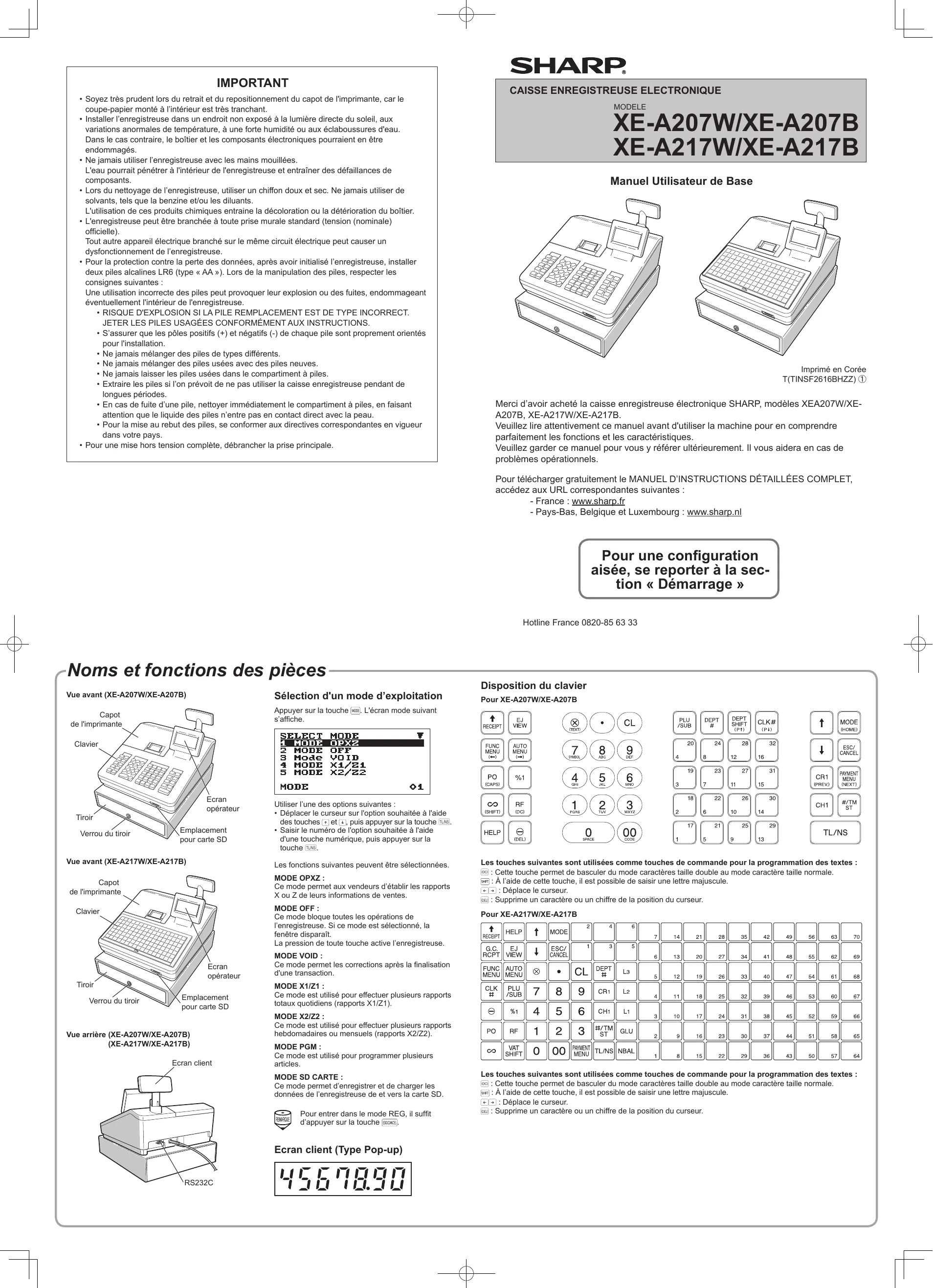 Merci d’avoir acheté la caisse enregistreuse électronique SHARP, modèles XEA207W/XE- A207B, XE-A217W/XE-A217B. Veuillez lire attentivement ce manuel avant d'utiliser la machine pour en comprendre parfaitement les fonctions et les caractéristiques. Veuillez garder ce manuel pour vous y référer ultérieurement. Il vous aidera en cas de problèmes opérationnels. Pour télécharger gratuitement le MANUEL D'INSTRUCTIONS DÉTAILLÉES COMPLET, accédez aux URL correspondantes suivantes : - France : www.sharp.fr - Pays-Bas, Belgique et Luxembourg : www.sharp.nl Pour une configuration aisée, se reporter à la sec- tion « Démarrage » Hotline France 0820-85 63 33 Disposition du clavier Pour XE-A207W/XE-A207B